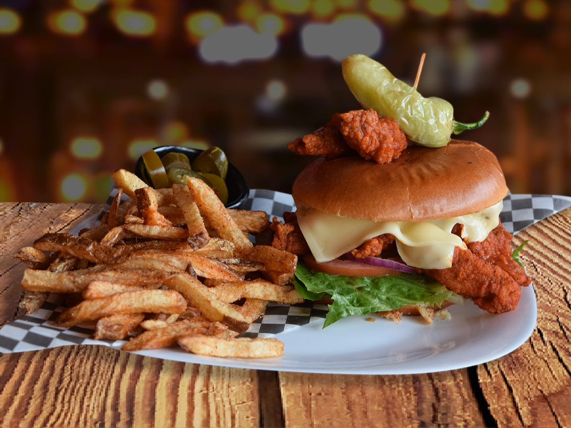 200 gramos de nuestros deliciosos boneless bufalo 100% pechuga, con queso suizo, tocino, lechuga, tomate, cebolla morada, chile güerito toreado y papas naturales o ensalada.