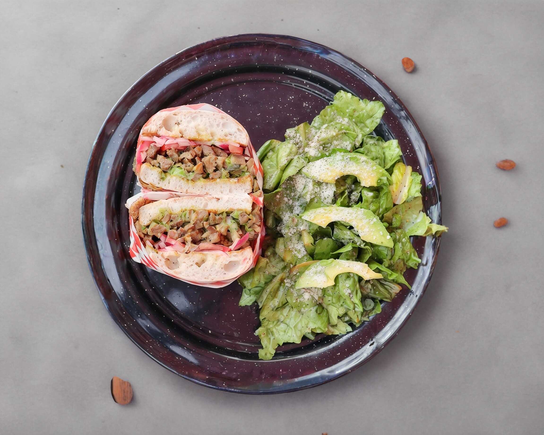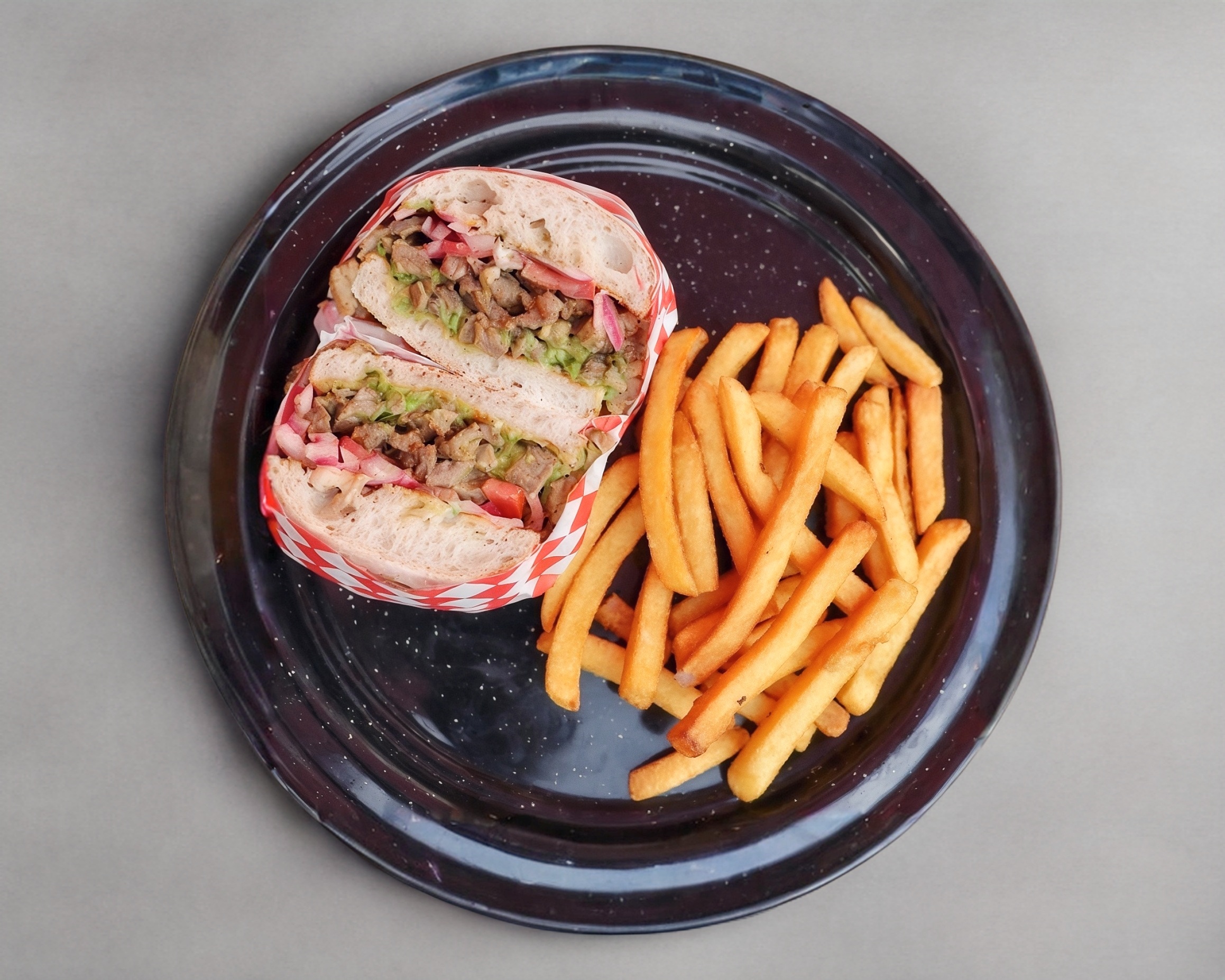 Torta Chica con pan ciabatta artesanal, carne asada con marinado de la casa, cama de guacamole, mayonesa, tomate y cebolla morada curtida.