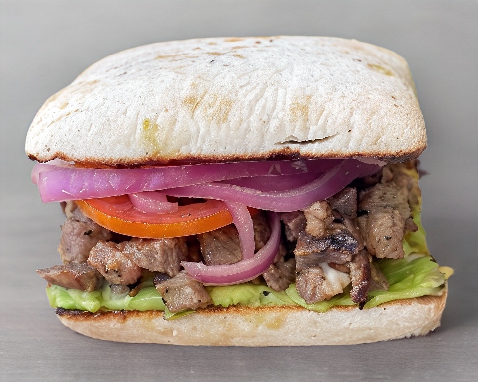 Torta con pan ciabatta artesanal, carne asada con marinado de la casa, cama de guacamole, mayonesa, tomate y cebolla morada curtida.