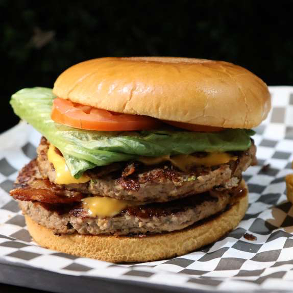 Pan brioche con aderezo de la casa, cama de lechuga, cebolla caramelizada, jalapeños a la plancha, doble carne de res de 160g c/u, doble queso americano y doble porción de tocino con baño de queso amarillo.