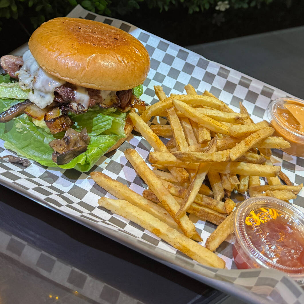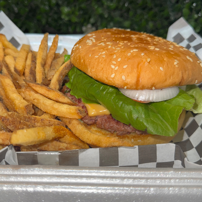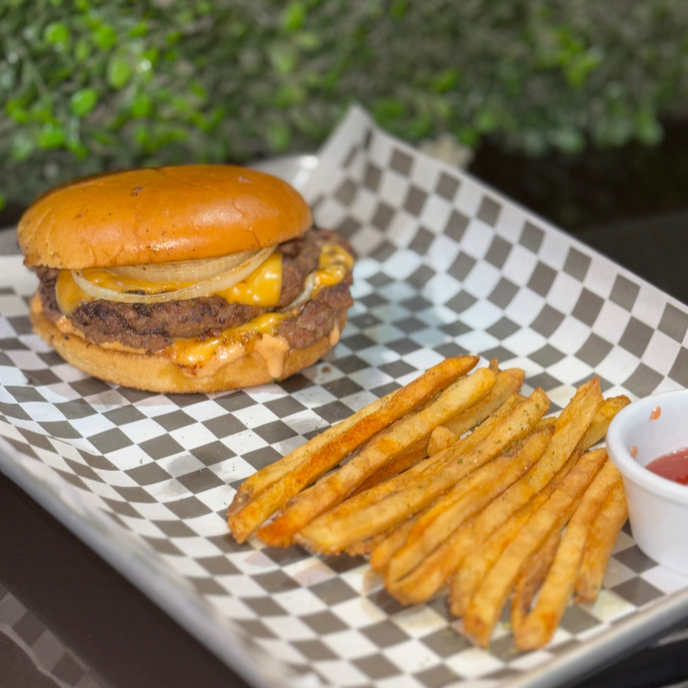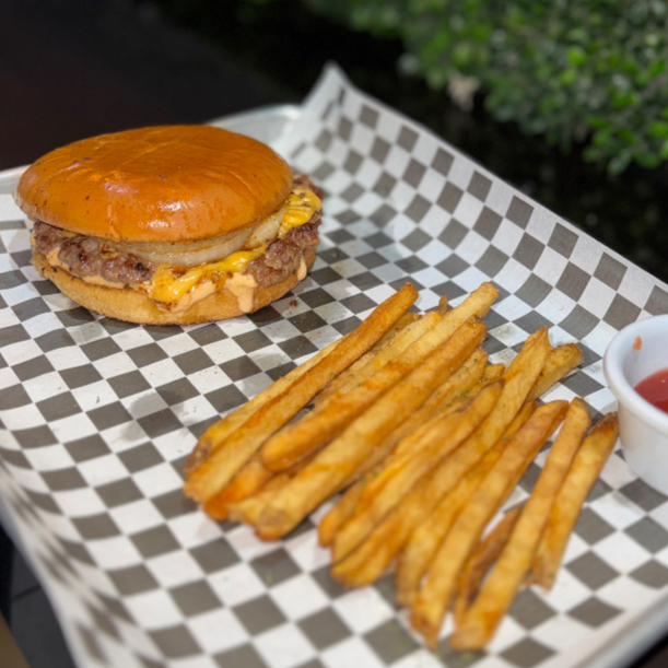 Pan brioche con aderezo de la casa, 130g de carne 100% de res smash , queso americano gratinado y cebolla caramelizada con una porción de papas fritas