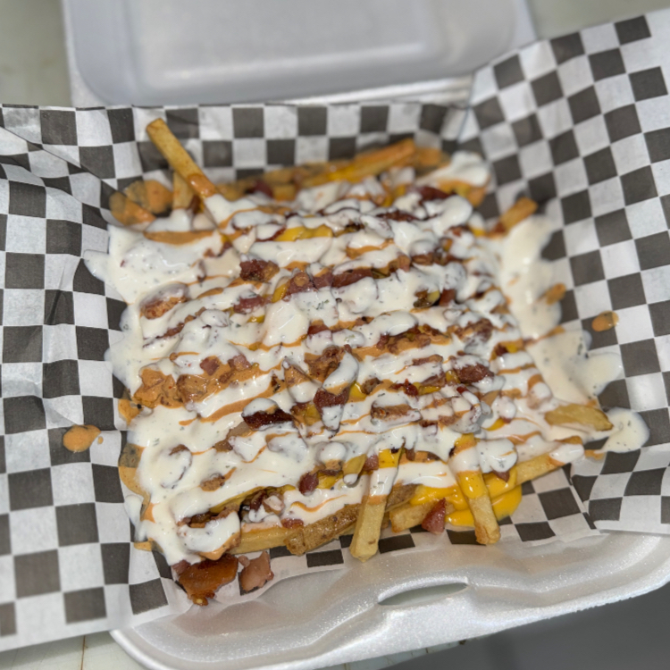 200g de papas fritas, bañadas en queso cheddar , con trozos de tocino , chipotle y ranch.