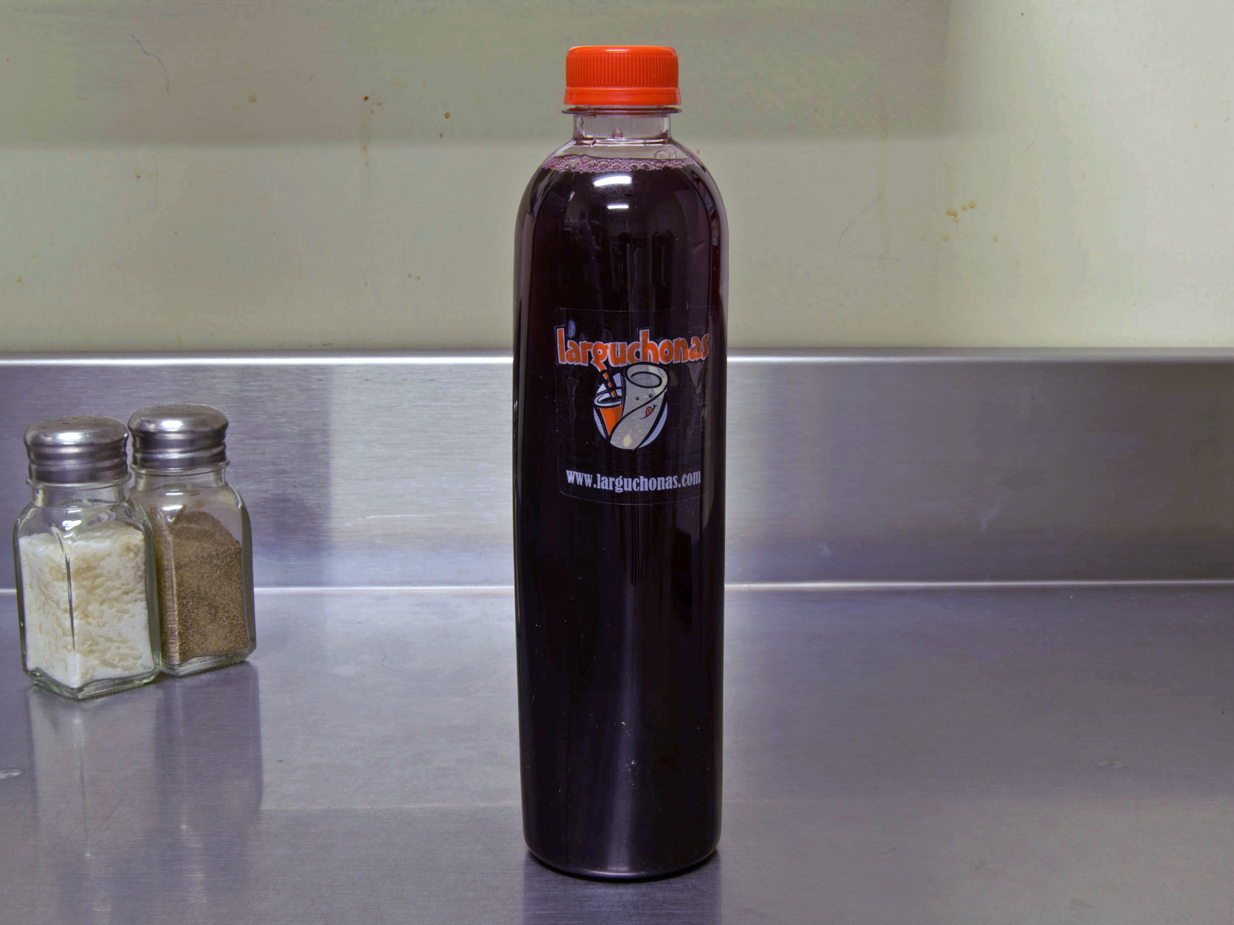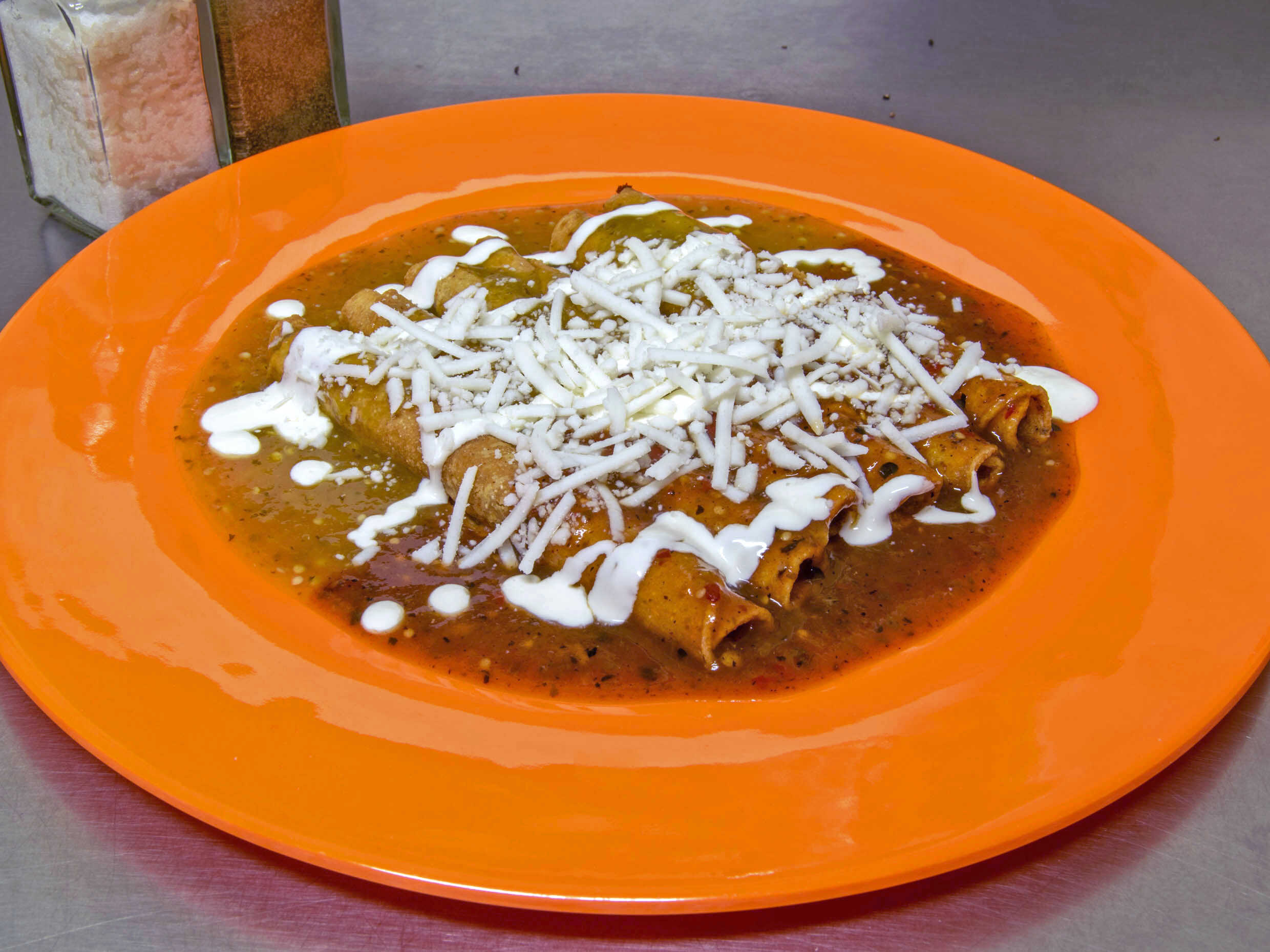 Larguchona de carne con: crema, salsa verde, salsa roja y queso.