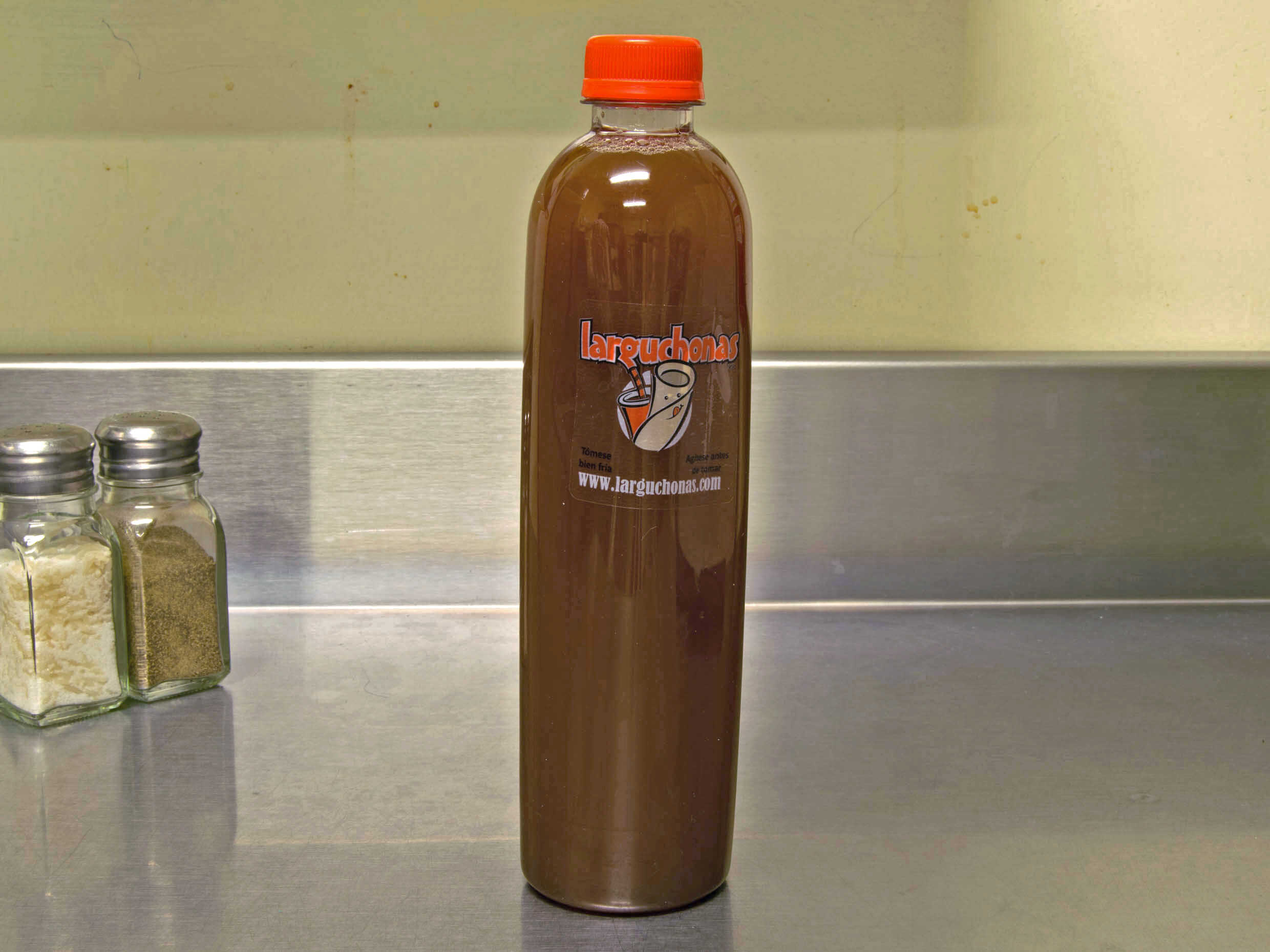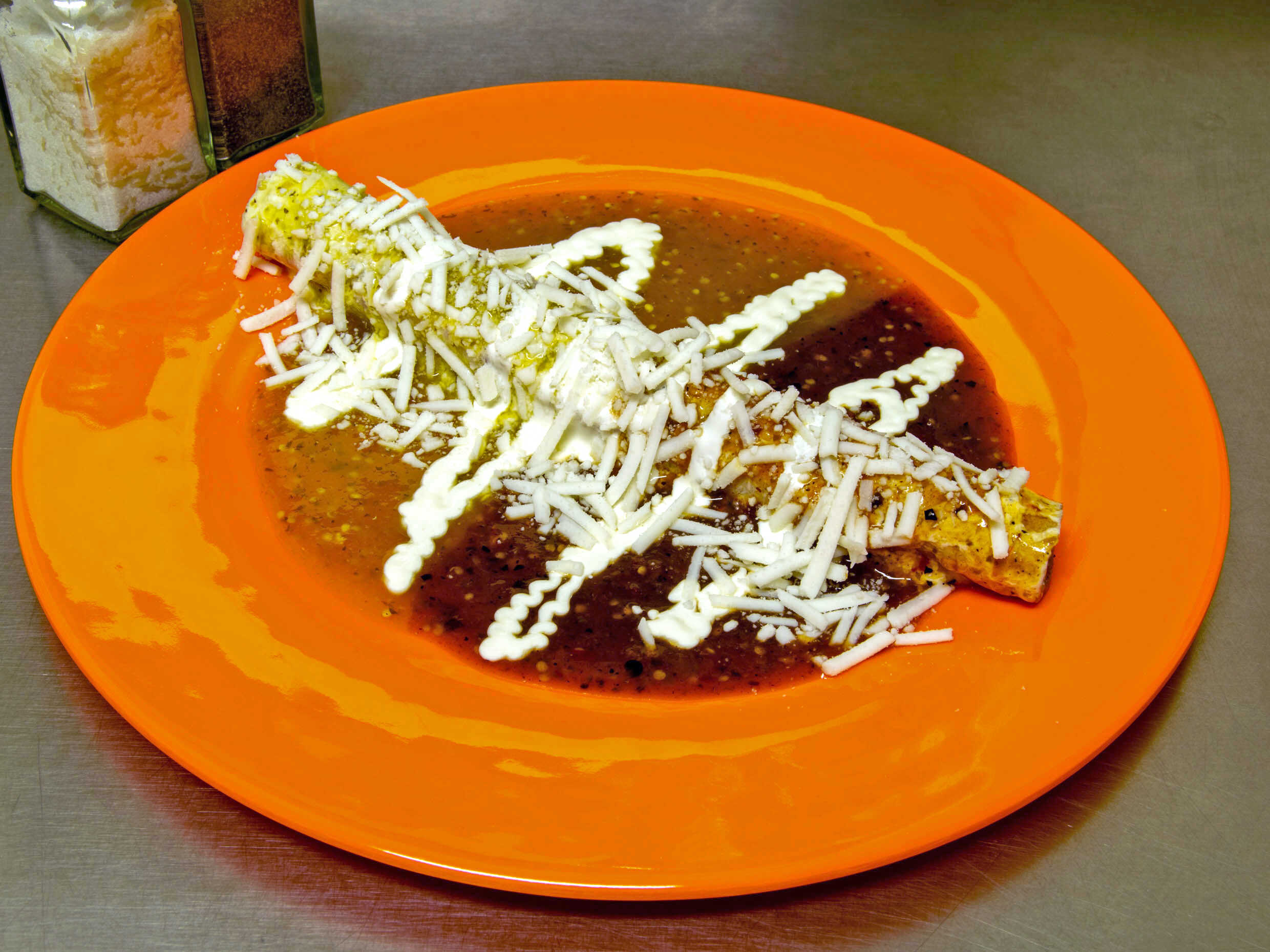 Larguchona de pollo con: crema, salsa verde, salsa roja y queso.