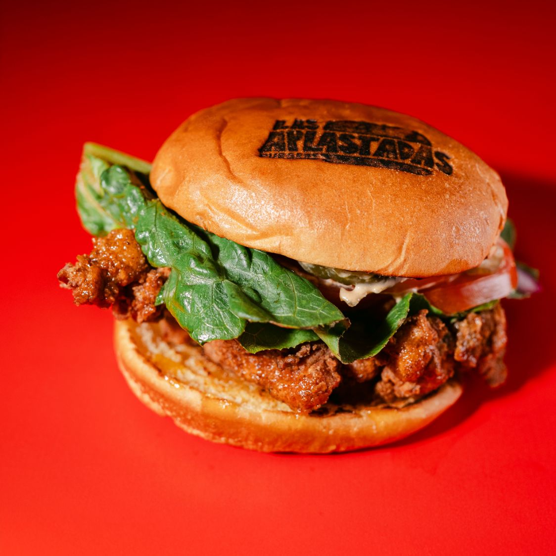 HAMBURGUESA DE POLLO FRITO, TOMATE, LECHUGA, CEBOLLA, PEPINILLOS Y ADEREZO SMASH