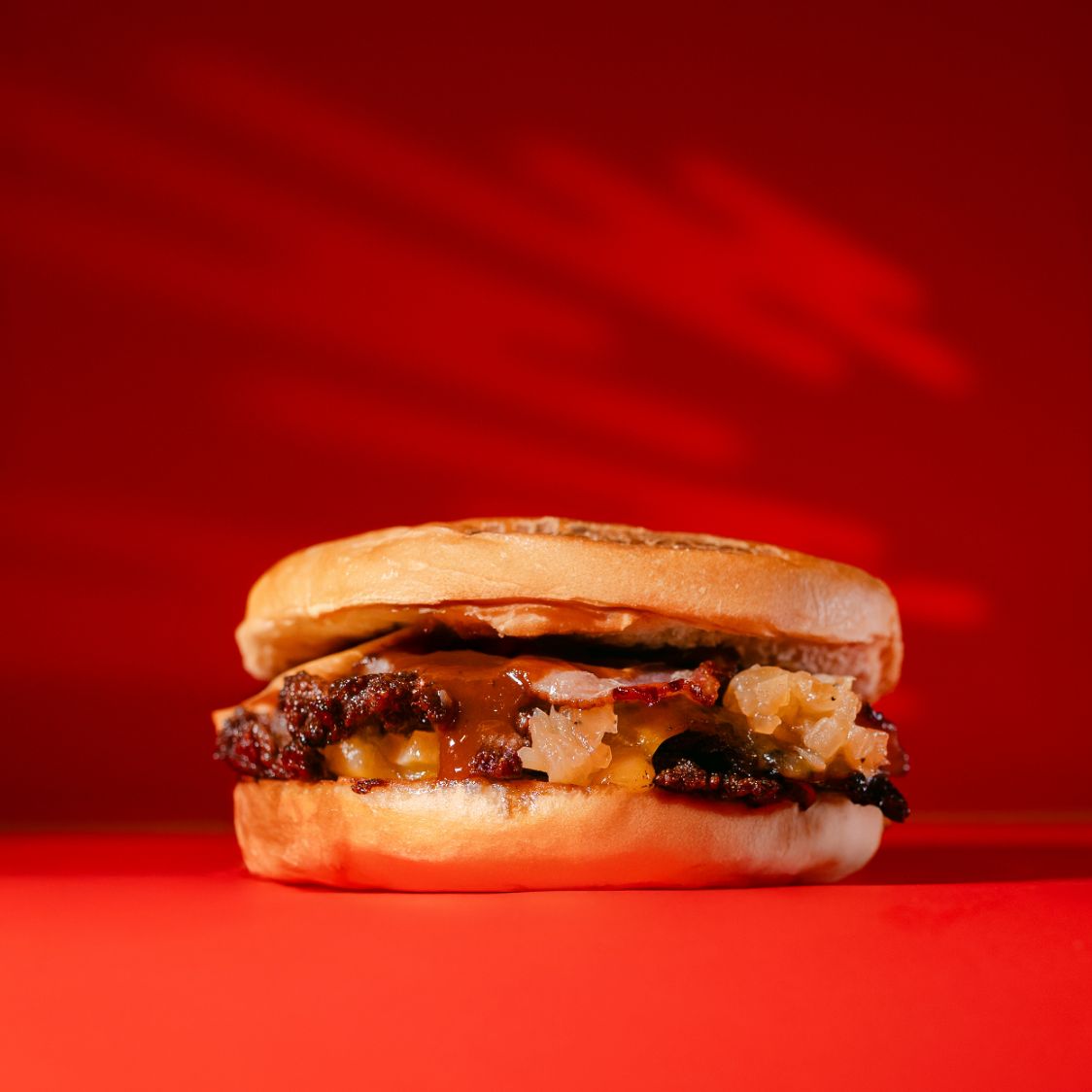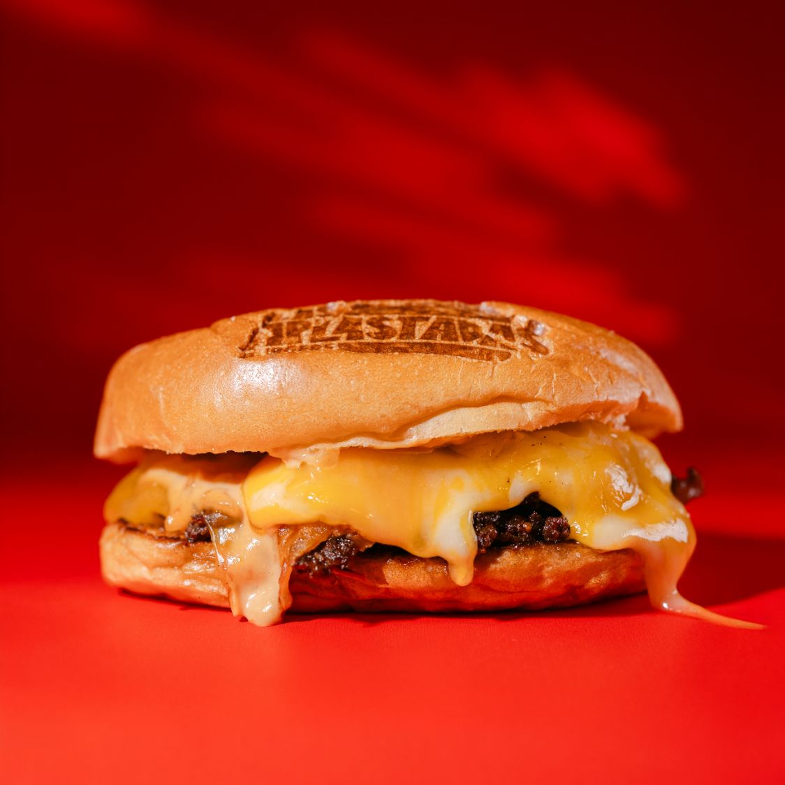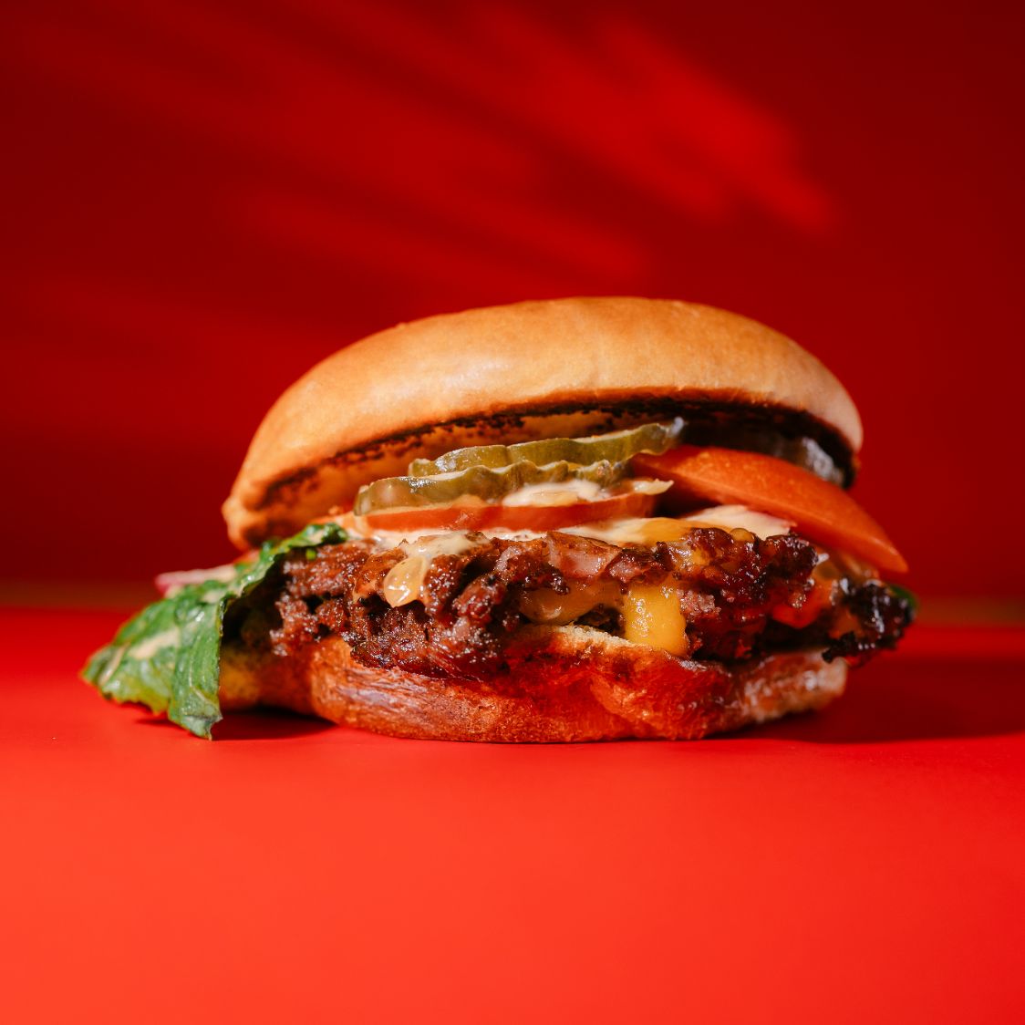 APLASTADA CON QUESO COLBY JACK, LECHUGA, TOMATE, CEBOLLA, PEPINILLOS Y ADEREZO SMASH