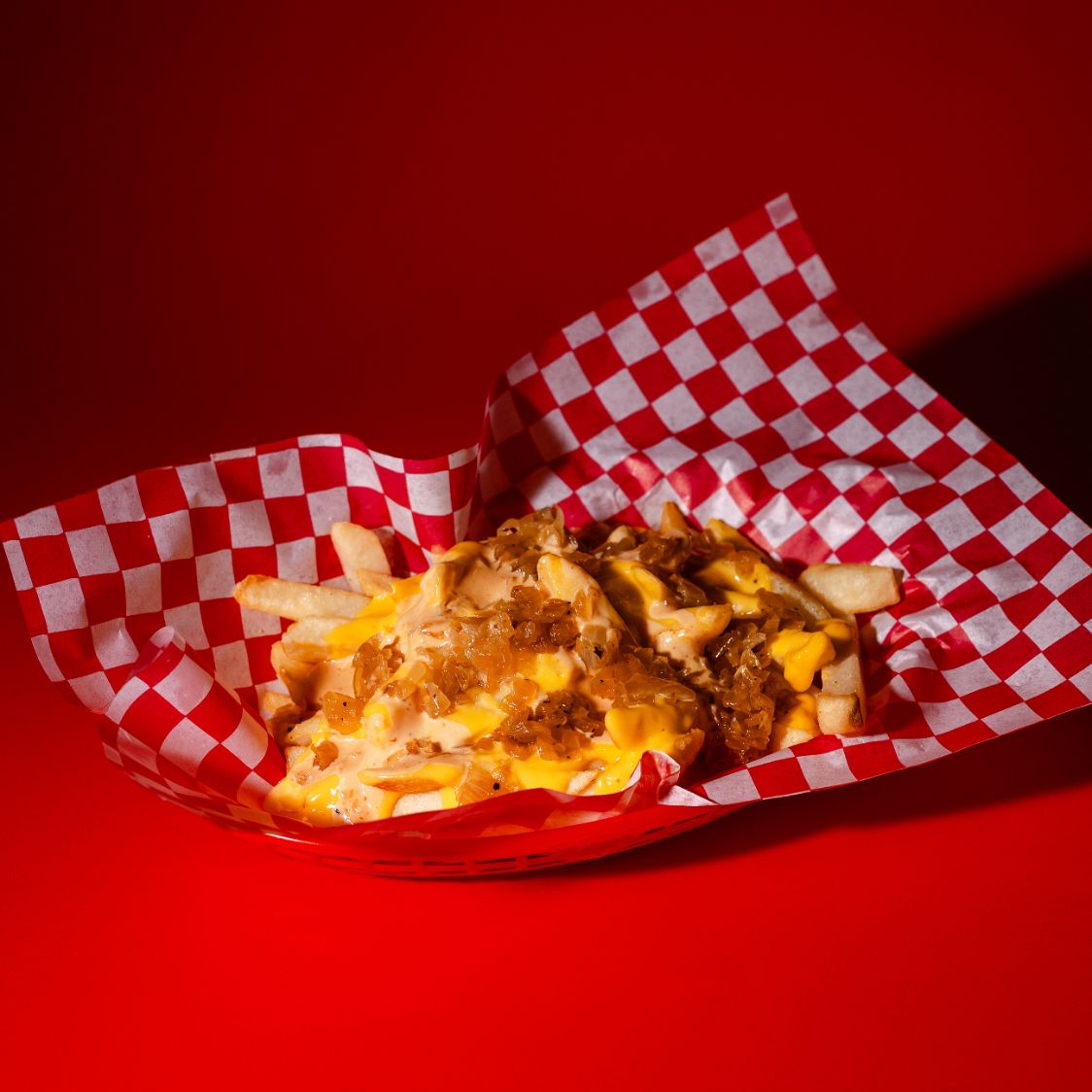 Papas fritas con queso, aderezo de la casa y cebolla caramelizada