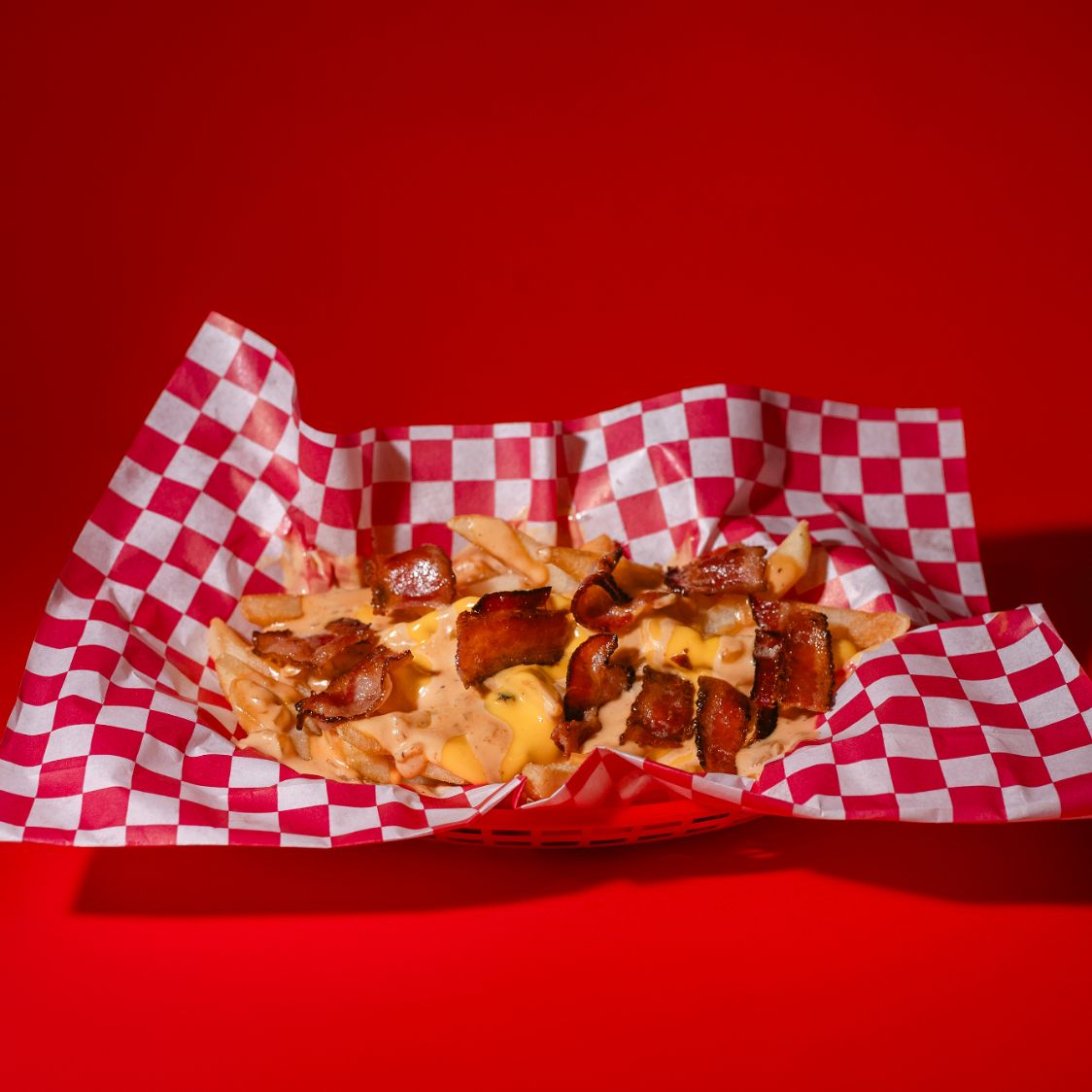 Papas fritas con queso, aderezo de la casa y trozos de tocino