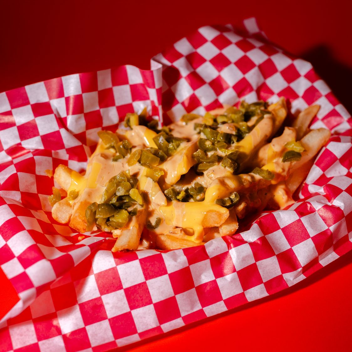 Papas fritas con queso,aderezo de la casa y jalapeño curtido