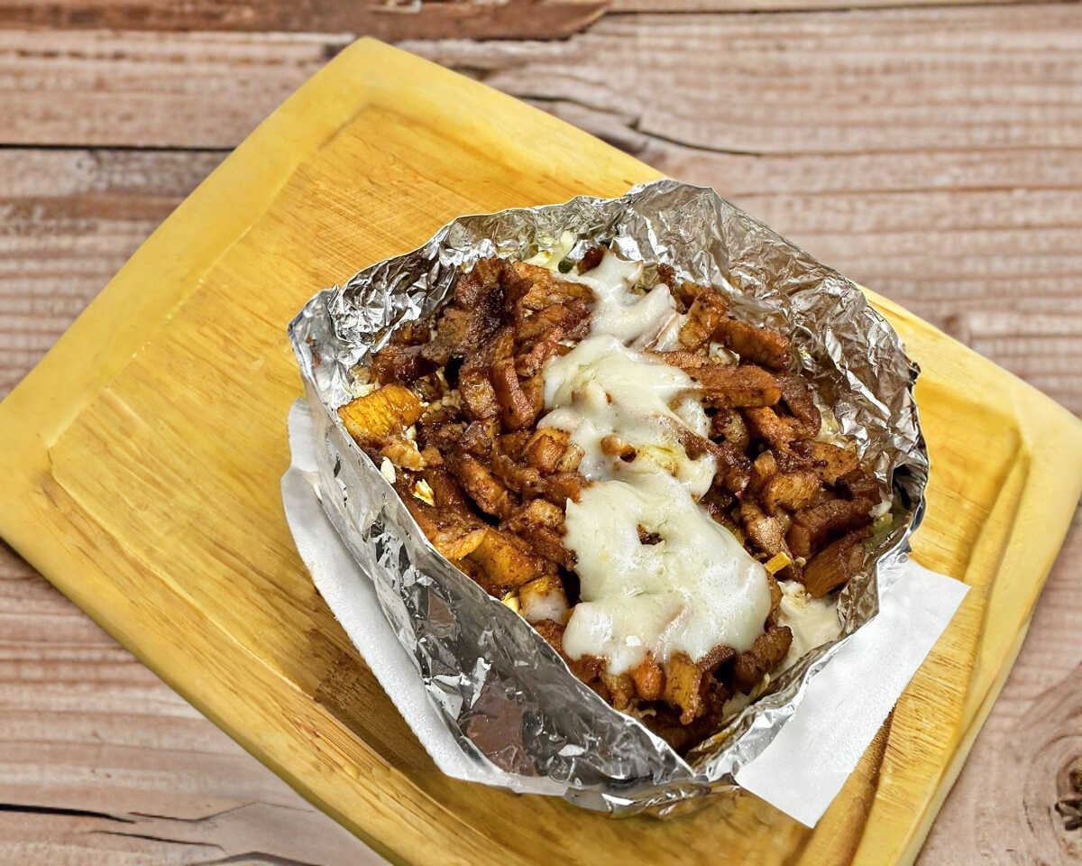 Carne de cerdo estilo Sinaloa bajo una capa de queso mozarella gratinado.
