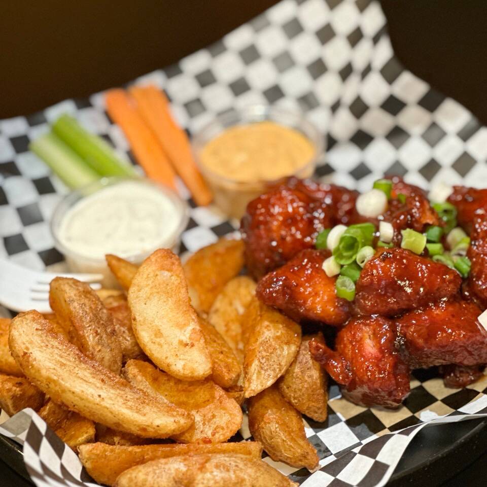 Papas fritas sazonadas con salsa buffalo, aderezo ranch, queso de nachos y coronadas con tocino, porción personal.