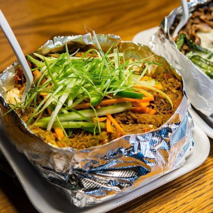 Jugoca carne deshebrada bajo una cama de verduras finamente picadas.