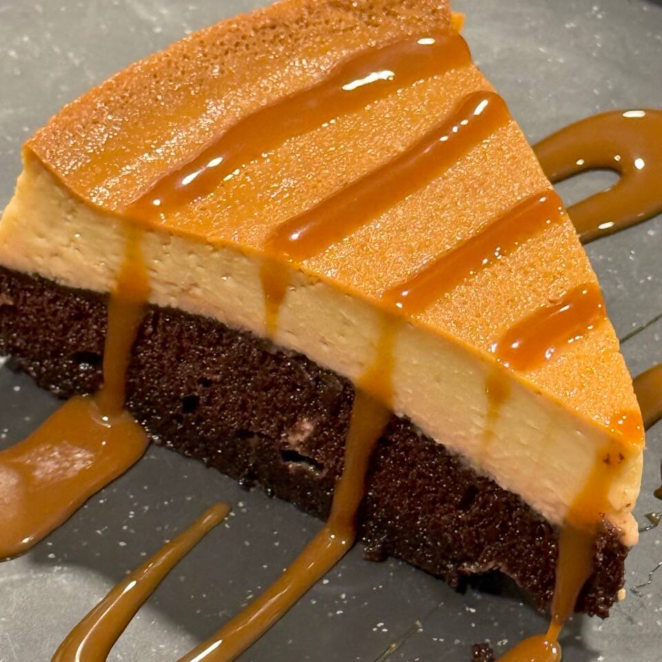 Pastel de chocolate con flan de vainilla, acompañado de deliciosa cajeta quemada, porción personal.