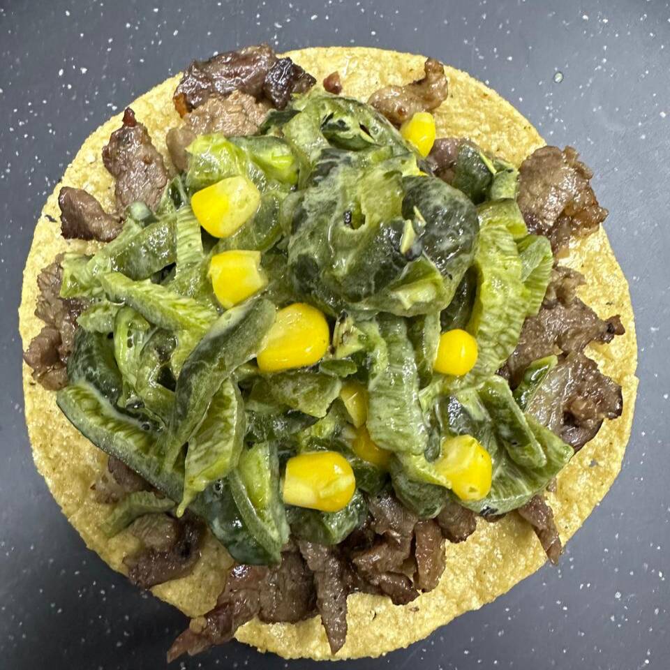 Tostada con carne asada con rajas con crema y elote (1 pieza).