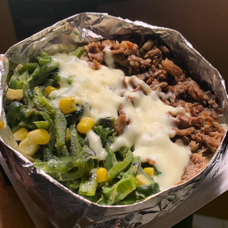 Mitad carne asada y mitas rajas con crema bajo una capa de queso mozarella gratinado. ((500gr) aproximados).