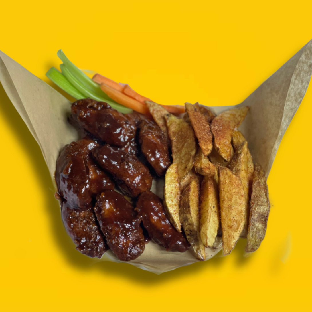 10 piezas (Salsa a elegir) acompañados de Papas Sazonadas, Bastones de Zanahoria y Apio.