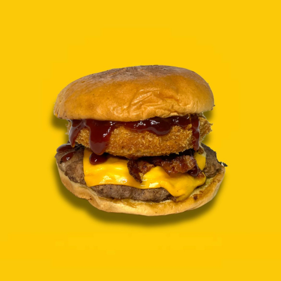 Hamburguesa de Carne, Tocino, Aros de Cebolla, Queso Amarillo, bañada en Salsa BBQ.