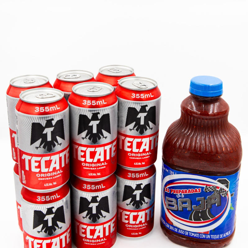 El paquete perfecto: 1 Clamato preparado de 1.89L acompañado de 12 botes de cerveza Tecate.