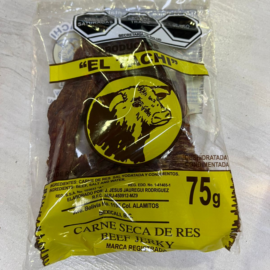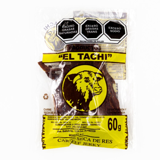 Sobre de carne seca de 60g, ideal como snack rápido.