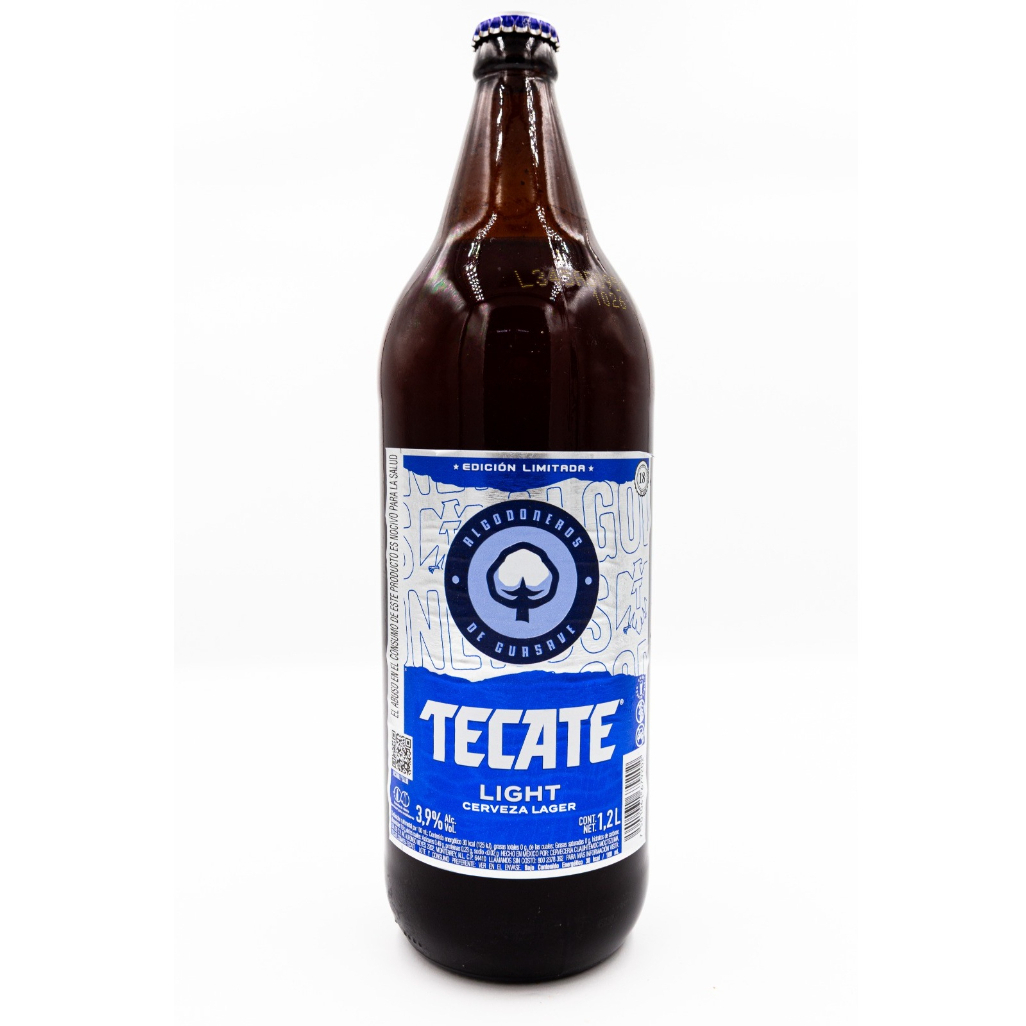 Cerveza Tecate original de 1.2l bien helada, presentación clásica.