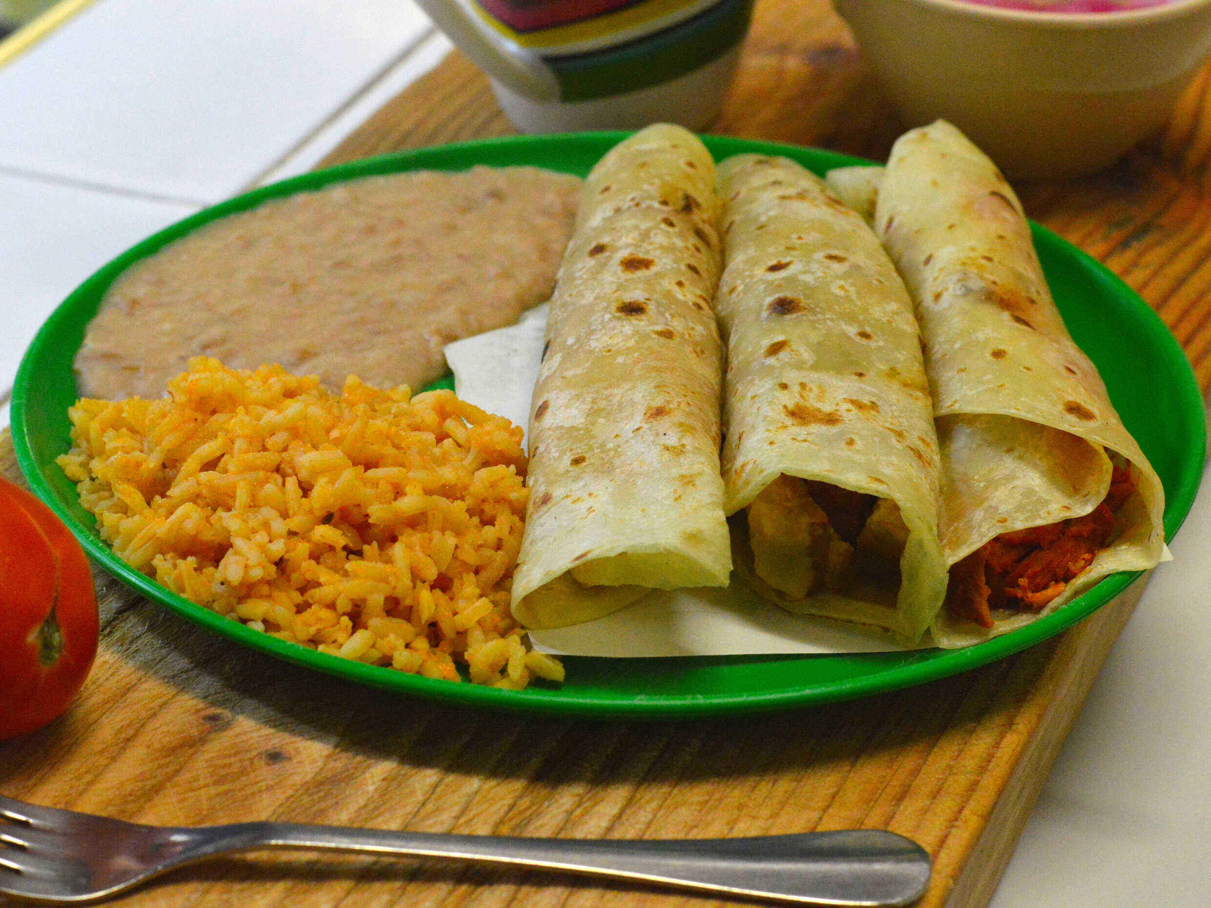 3 Tacos de Harina con Frijoles y Arroz