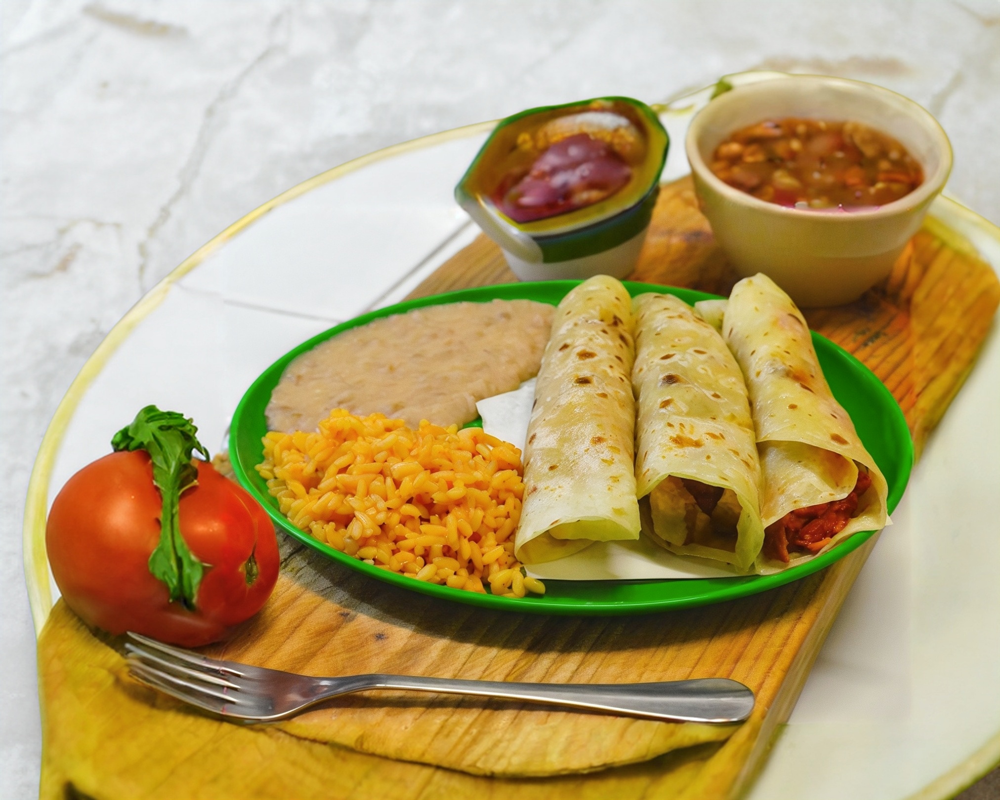 3 Tacos de Harina con Frijoles y Arroz*1 + Agua de sabor*1