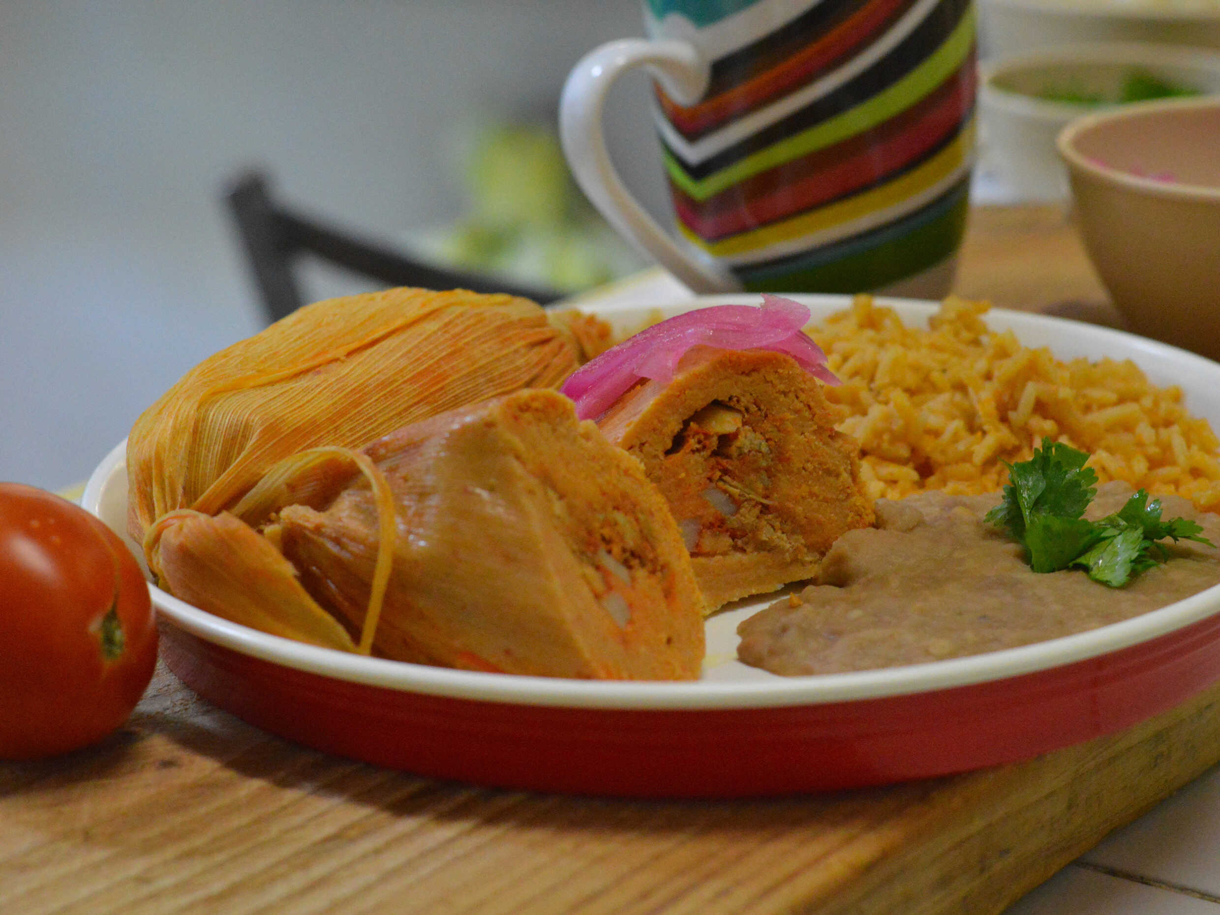 2 Tamales de res acompañado de arroz y frijol.