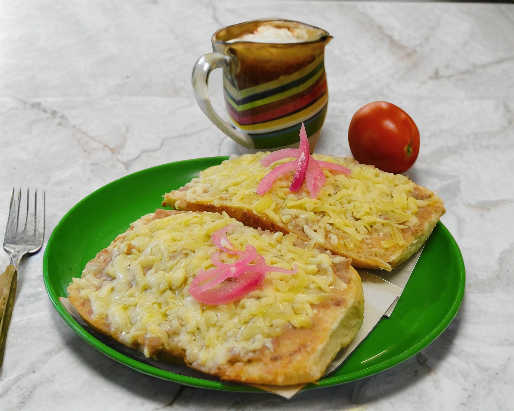 2 Rebanadas de pan con capa de fríjol y queso gratinado.