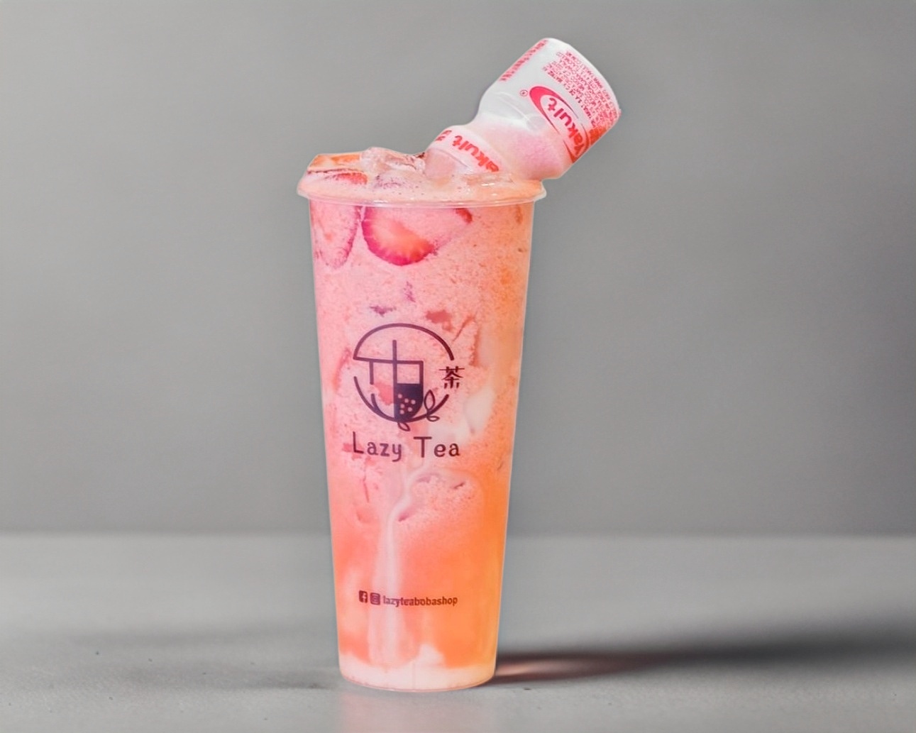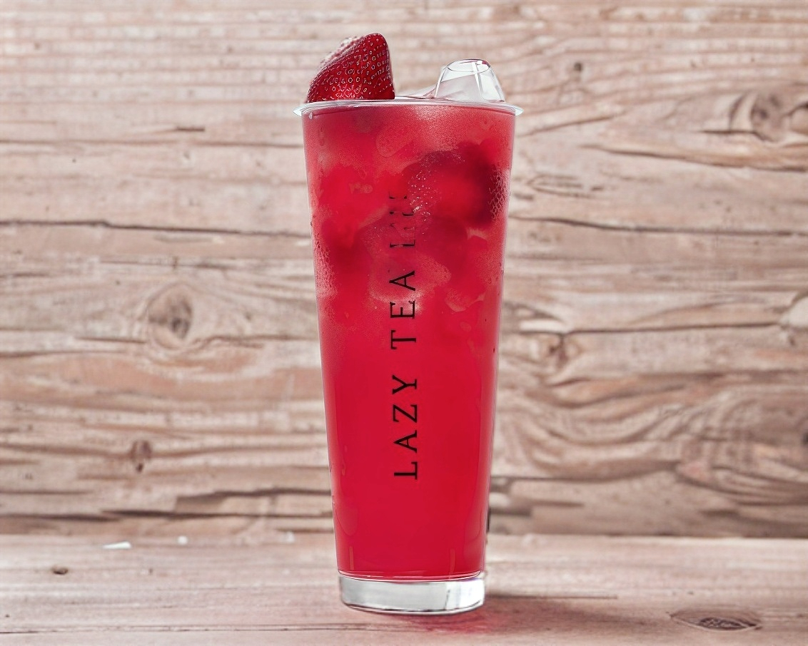 Bebida de fresa a las rocas a base de té de fruta. No incluye boba.