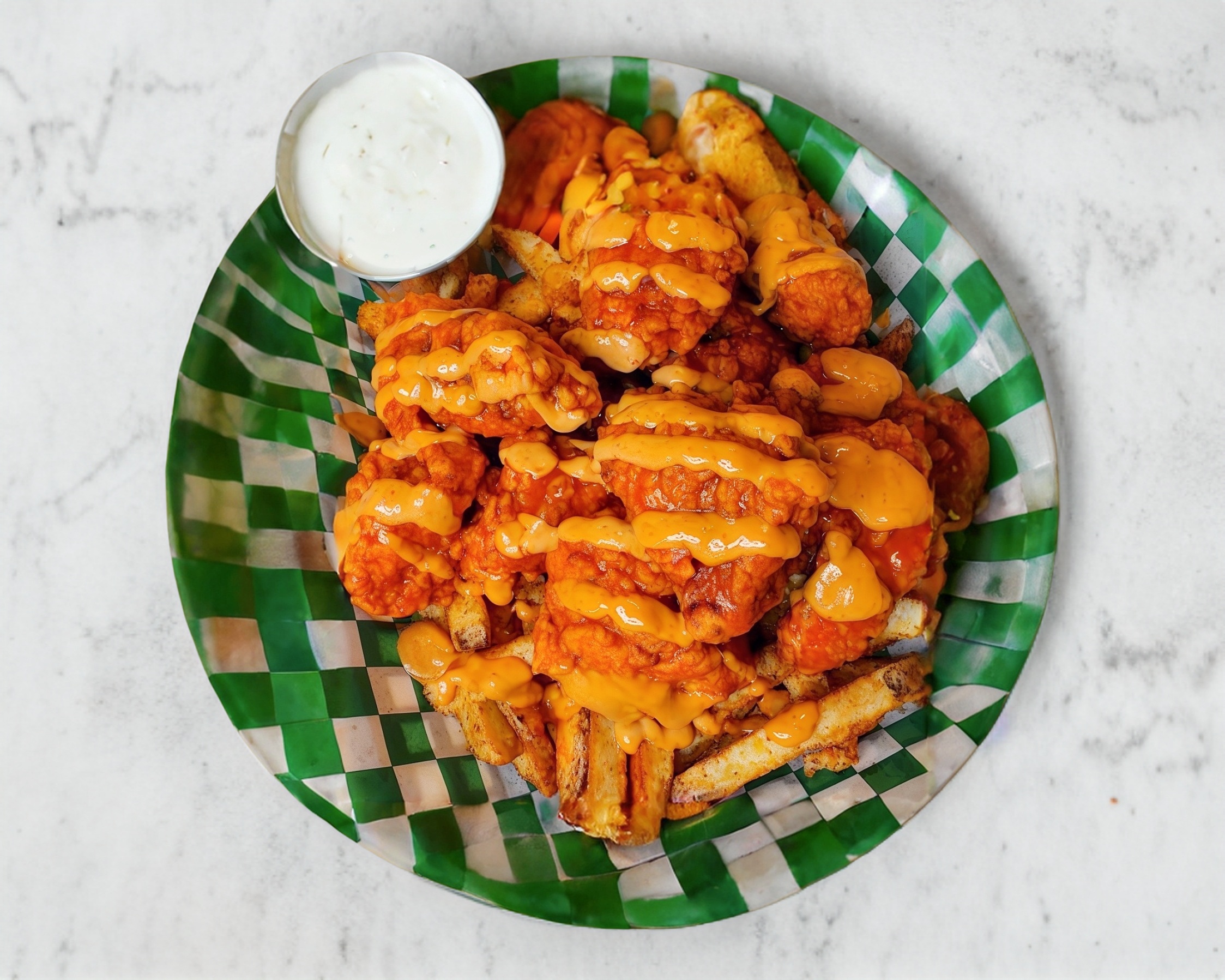 Base de papas fritas bañadas con queso amarillo y boneless en trozos con la salsa de preferencia bañados con toping de aderezo chipotle, queso y rancho.