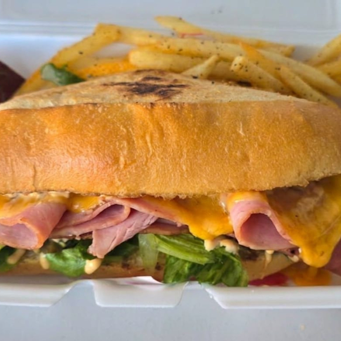 Jamón con queso amarillo derretido en birote de panadería, acompañada de papas a la francesa, chiles y salsa catsup.