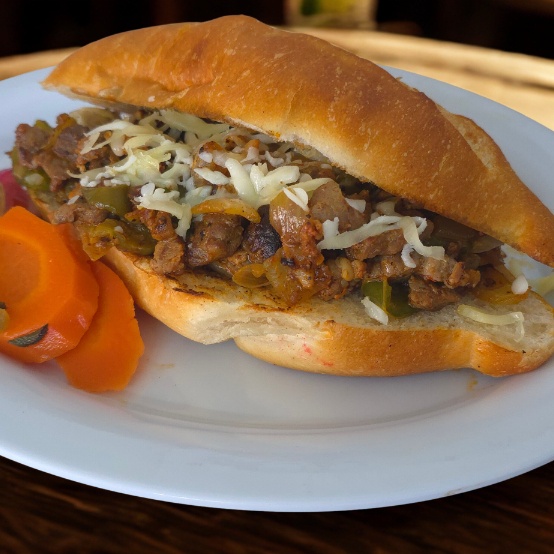 Deliciosa carne deshebrada con verduras en birote de panadería, acompañada de papas a la francesa.