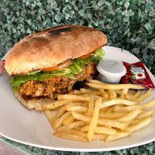 Deliciosa hamburguesa de pechuga de pollo empanizada (Salsa a elegir) acompañada de crujientes papas en gajo.