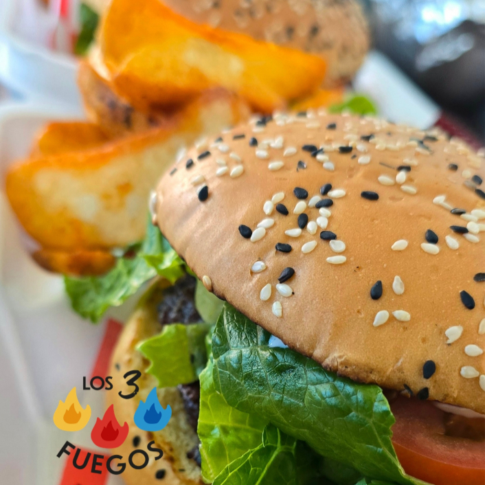 Hamburgesa con carne 100% de res acompañado de crujientes papas en gajo.