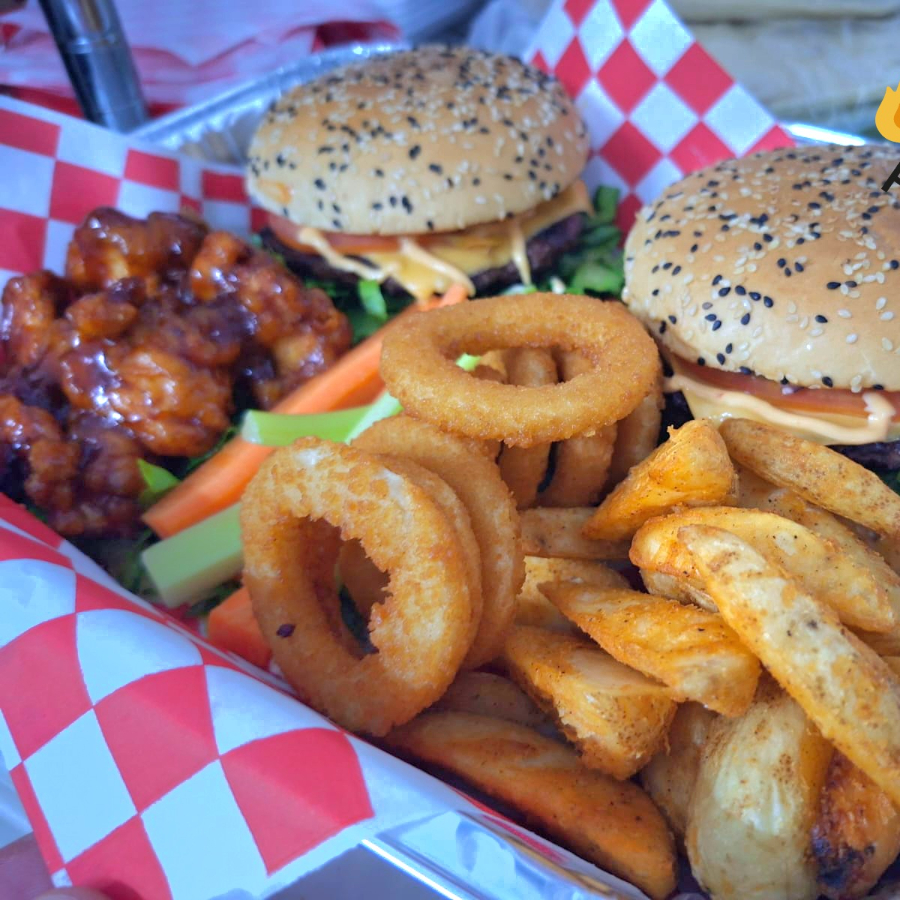 HAMBURGUESA CLASICA*2 + Papas Gajo*1 + ORDEN DE BONELESS NATURALES PARA CHAROLA*1 + Aros de Cebolla*1