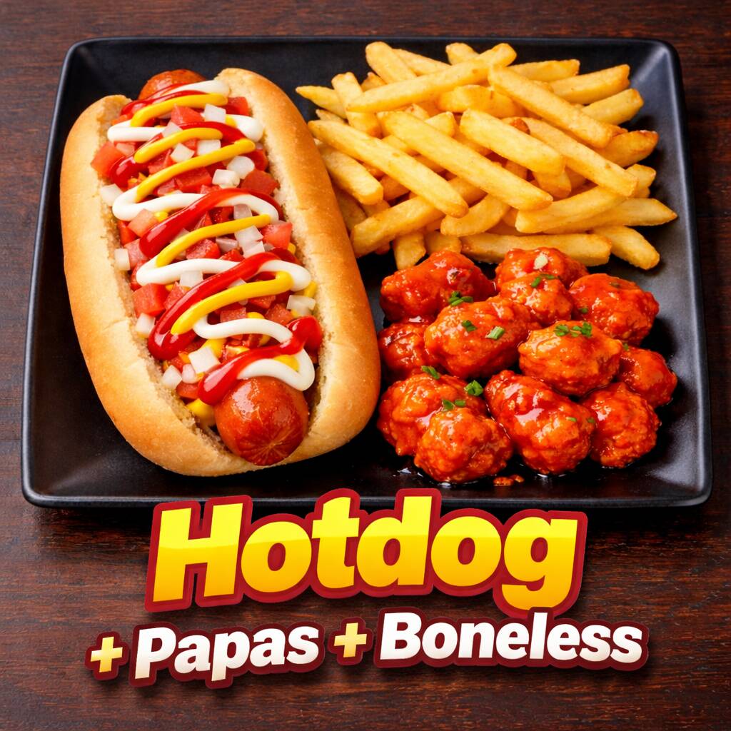 1 Hotdog Sencillo + Boneless en Salsa de su Preferencia + Papas Fritas