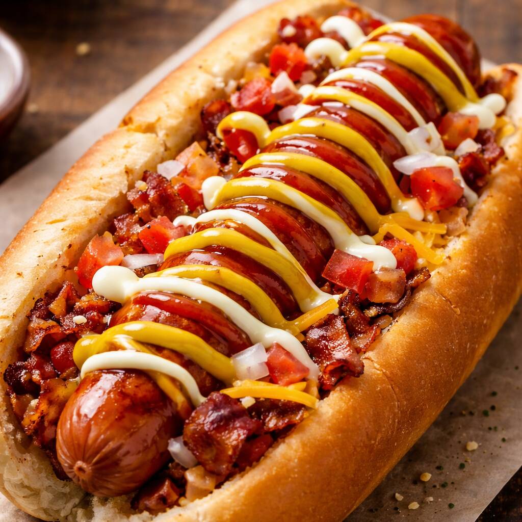 Salchicha de Pavo en Pan Medias Noches Acompañado de Tomate, Cebolla, Ketchup, Mayonesa y Mostaza