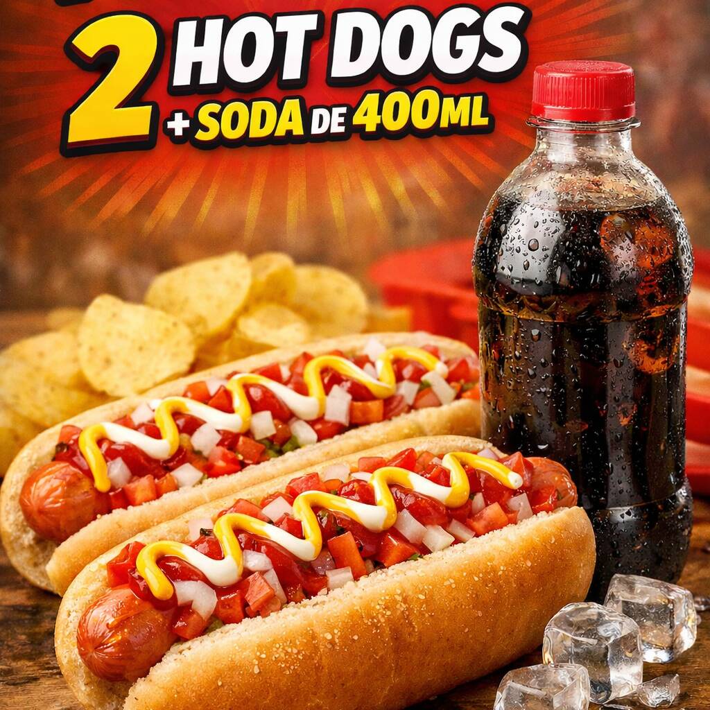2 Hot Dogs Sencillos con Tomate, Cebolla, Ketchup, Mayonesa y Mostaza Acompañados de 1 Soda de 400ml