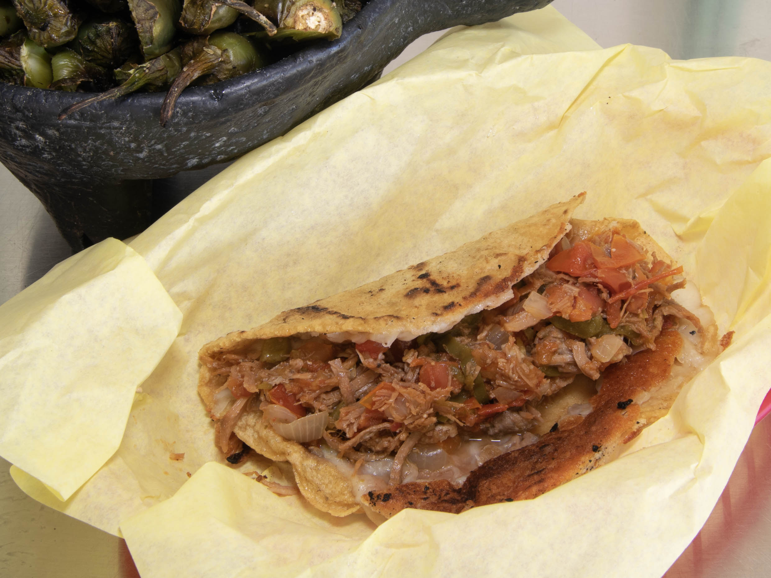 Quesadilla con queso tipo Monterey Jack con el guisado que sea de su elección.