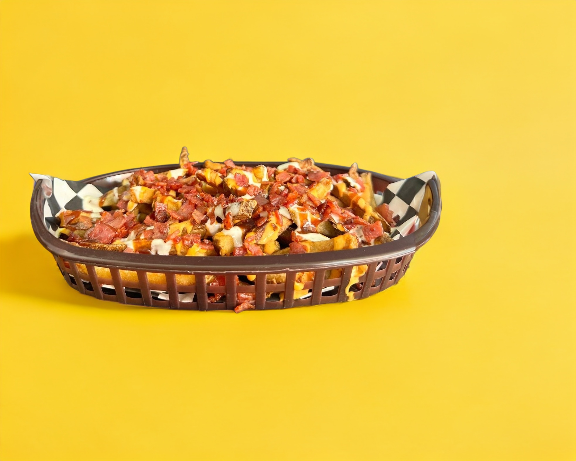 Papas preparadas con Ranch, BBQ, Chipotle, Queso Amarillo y tocino