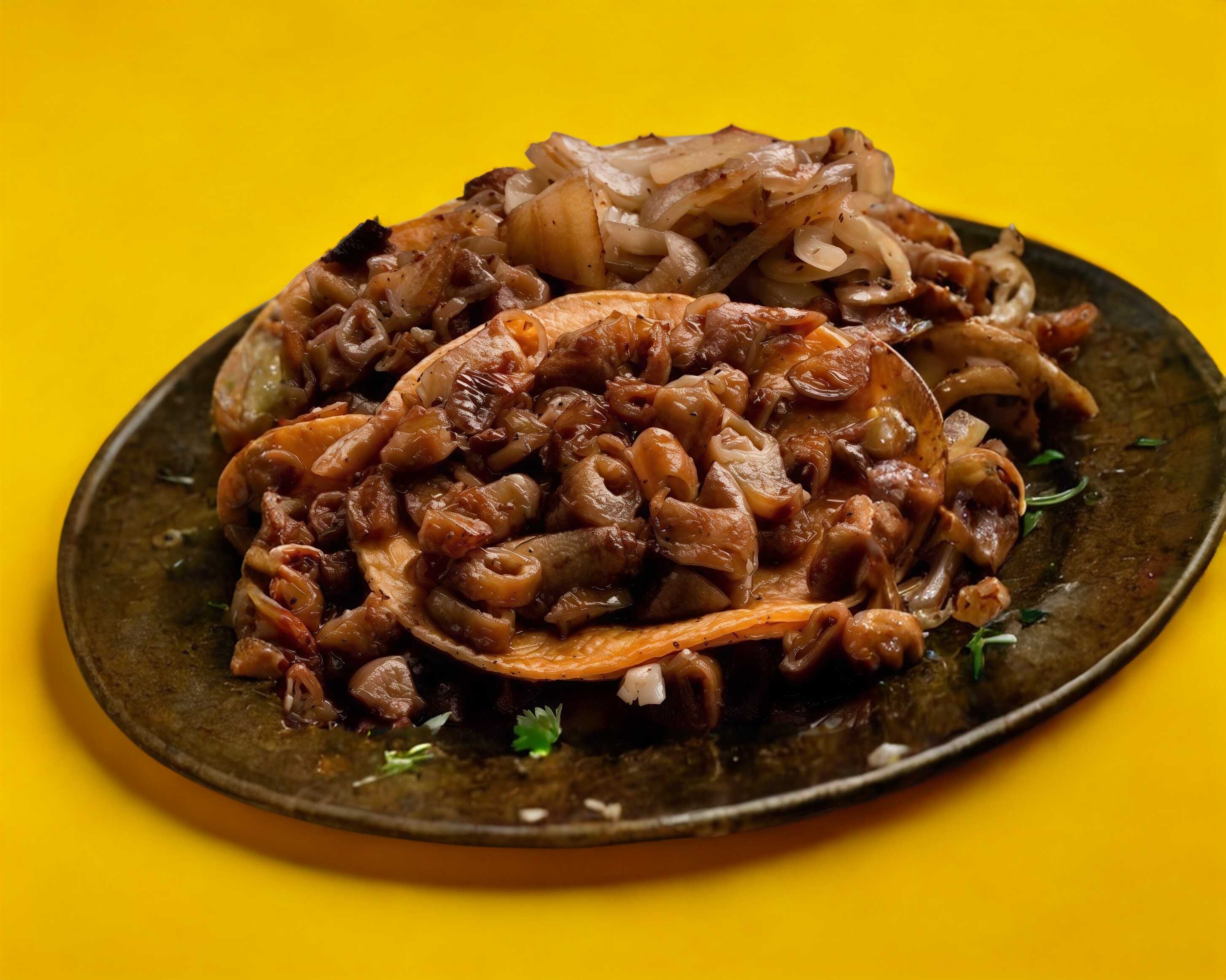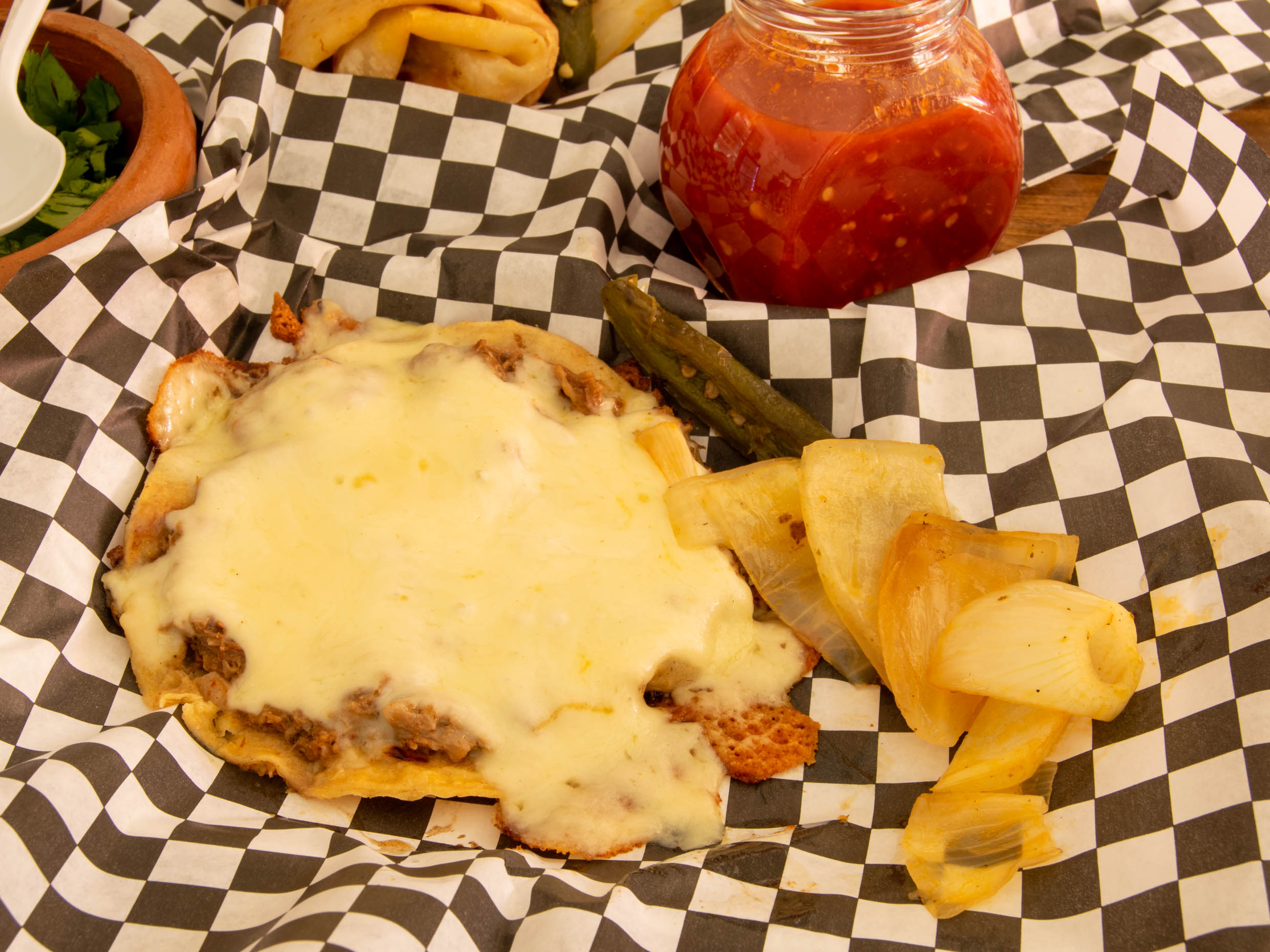 Tostada de maíz con queso y birria de res acompañado de salsa de la casa, cebolla, repollo, limones, cilantro, ademas de chile, cebolla asada.