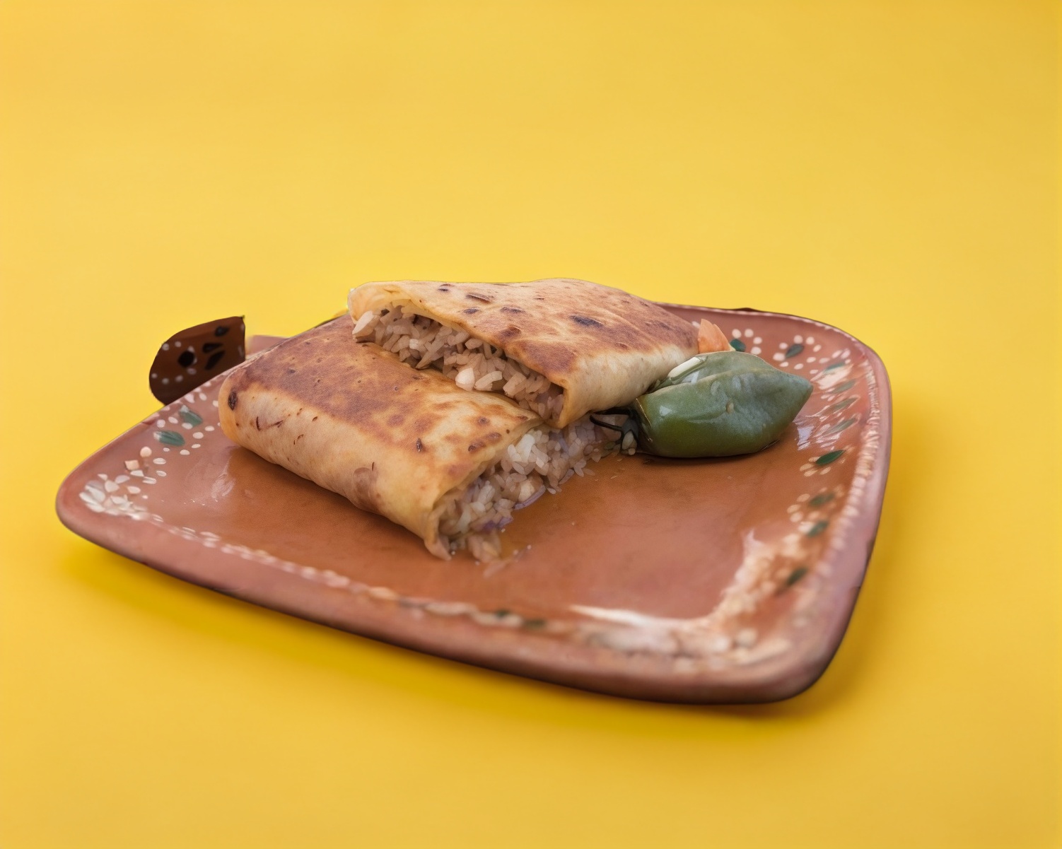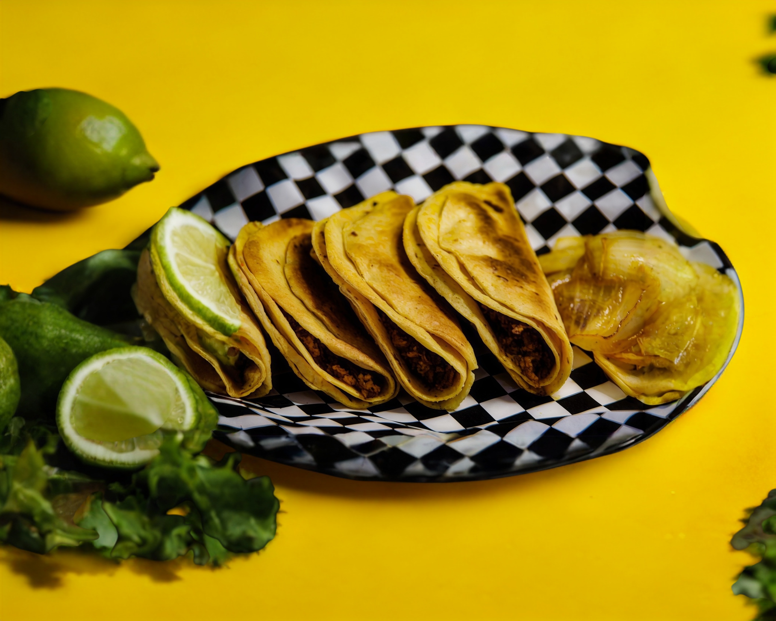 Doraditos tortilla de maíz crujiente, con queso, carne de birria de res, acompañado de salsa de la casa, cebolla, repollo, limones, cilantro, además de chile y cebolla asada.