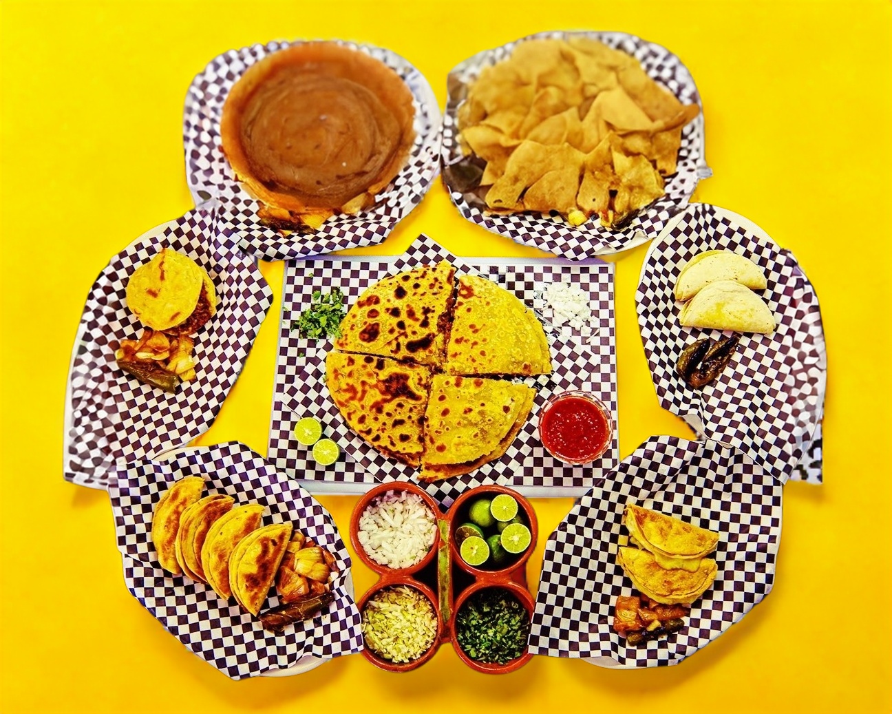 Queso gratinado, Carne Asada y Carne al pastor, acompañada de salsa bandera, salsa tatemada, guacamole, limon y repollo
