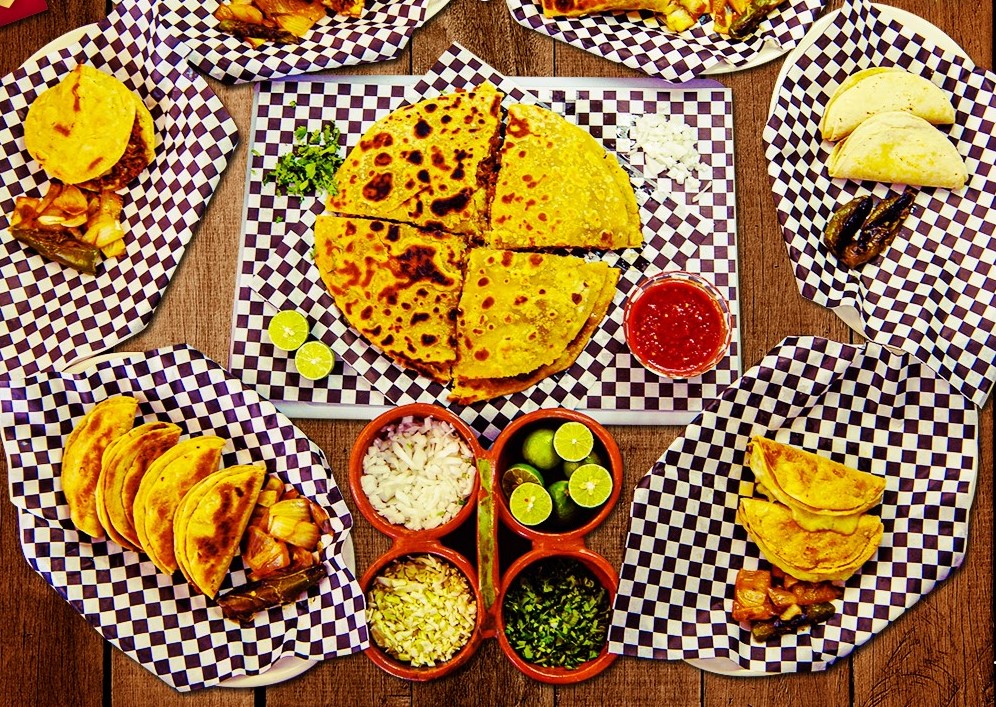 QUESADILLA DE TRIPA DORADITA, ACOMPAÑADA DE GUACAMOLE, FRIJOLES, SALSA BANDERA, SALSA ROJA, CEBOLLA ASADA Y CHILE