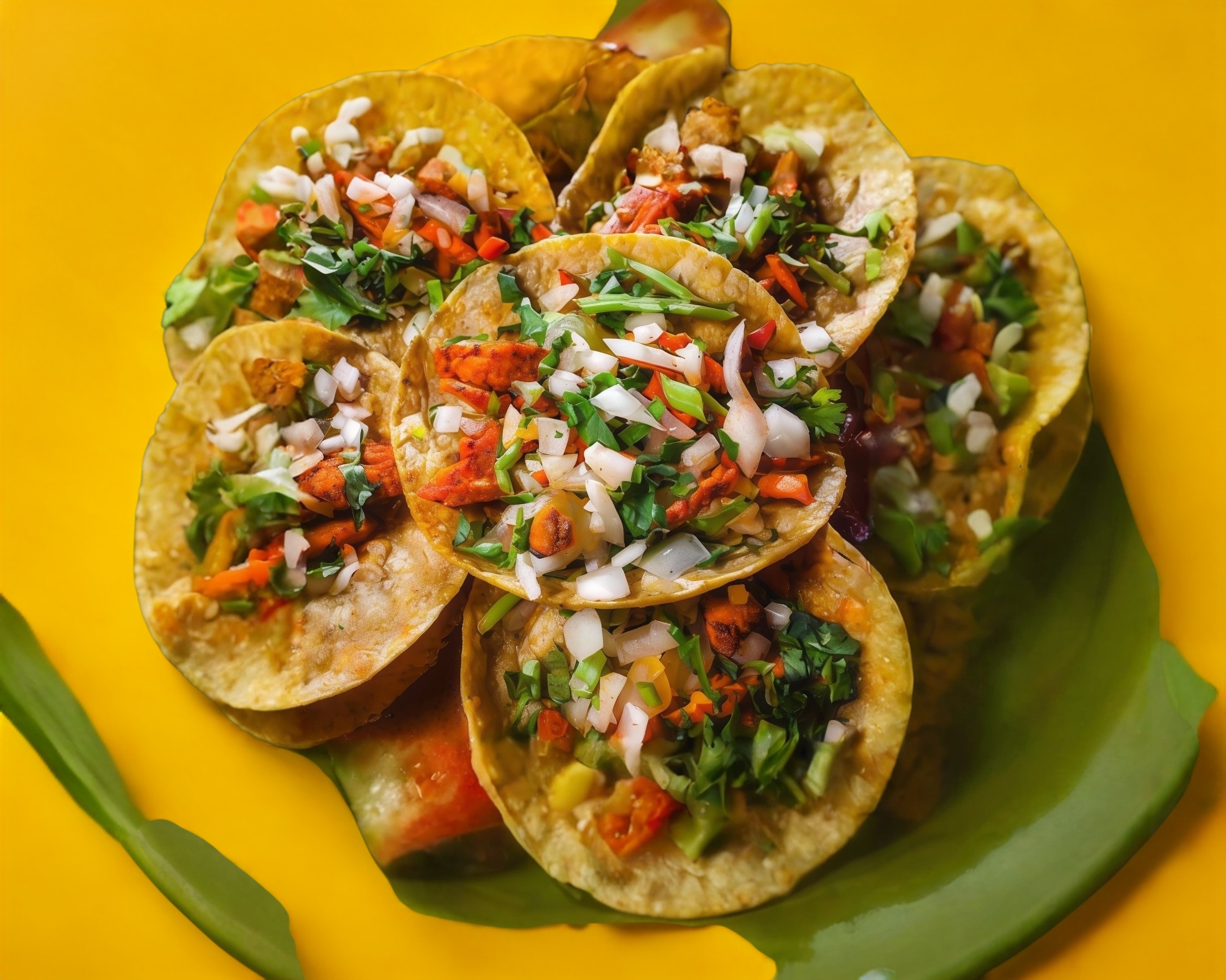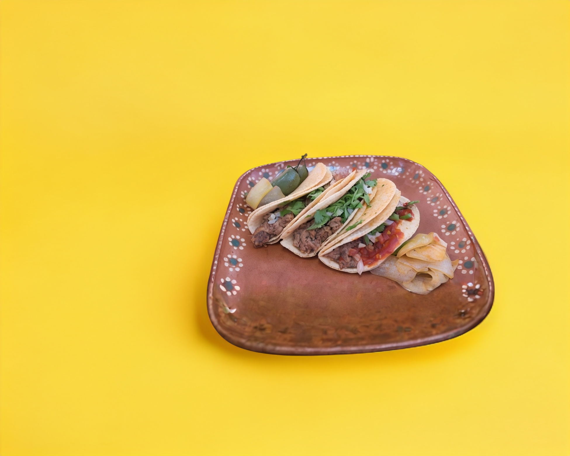 TACO DE PASTOR ACOMPAÑADA DE GUACAMOLE, FRIJOLES, SALSA BANDERA, SALSA ROJA, CEBOLLA ASADA Y CHILE
