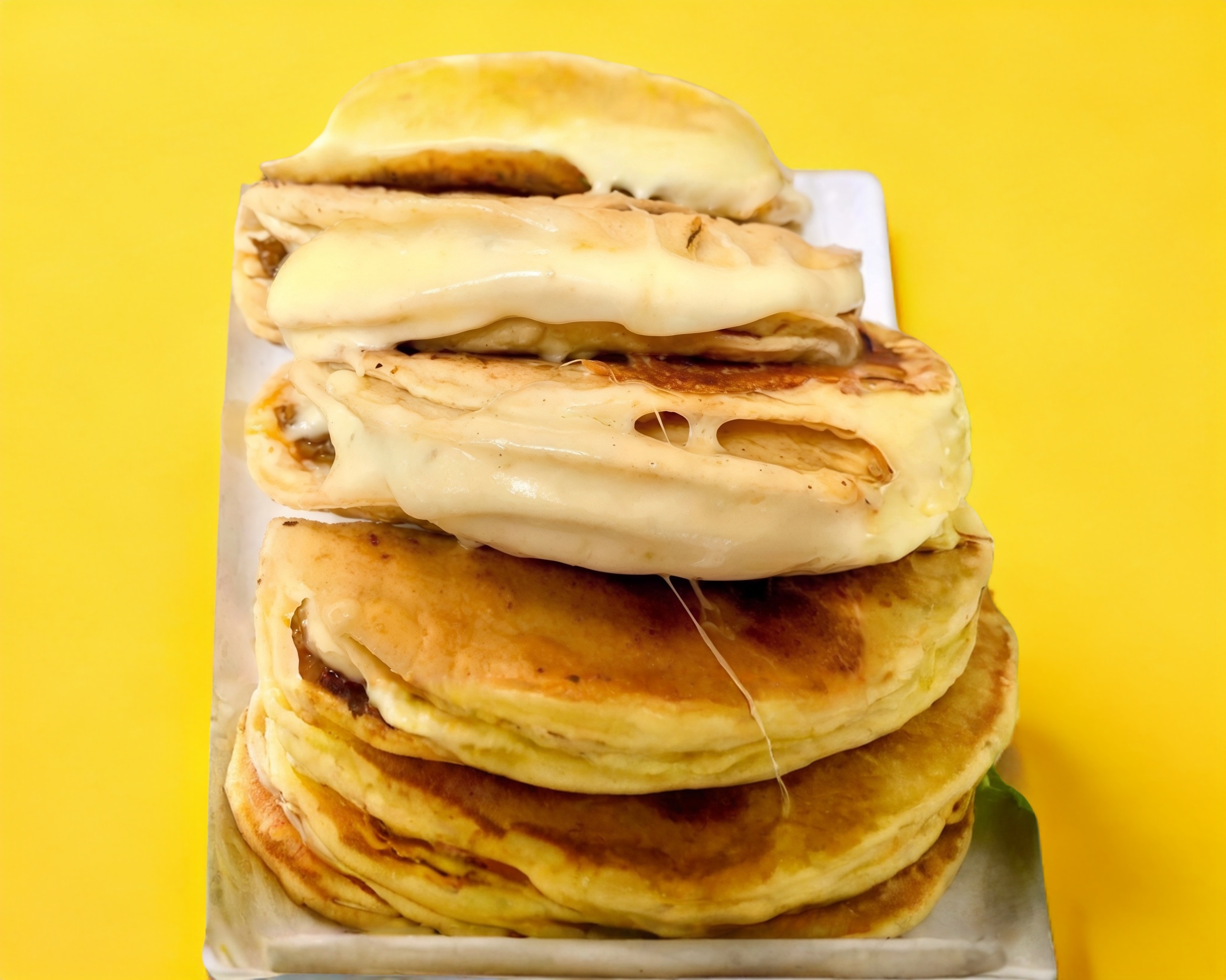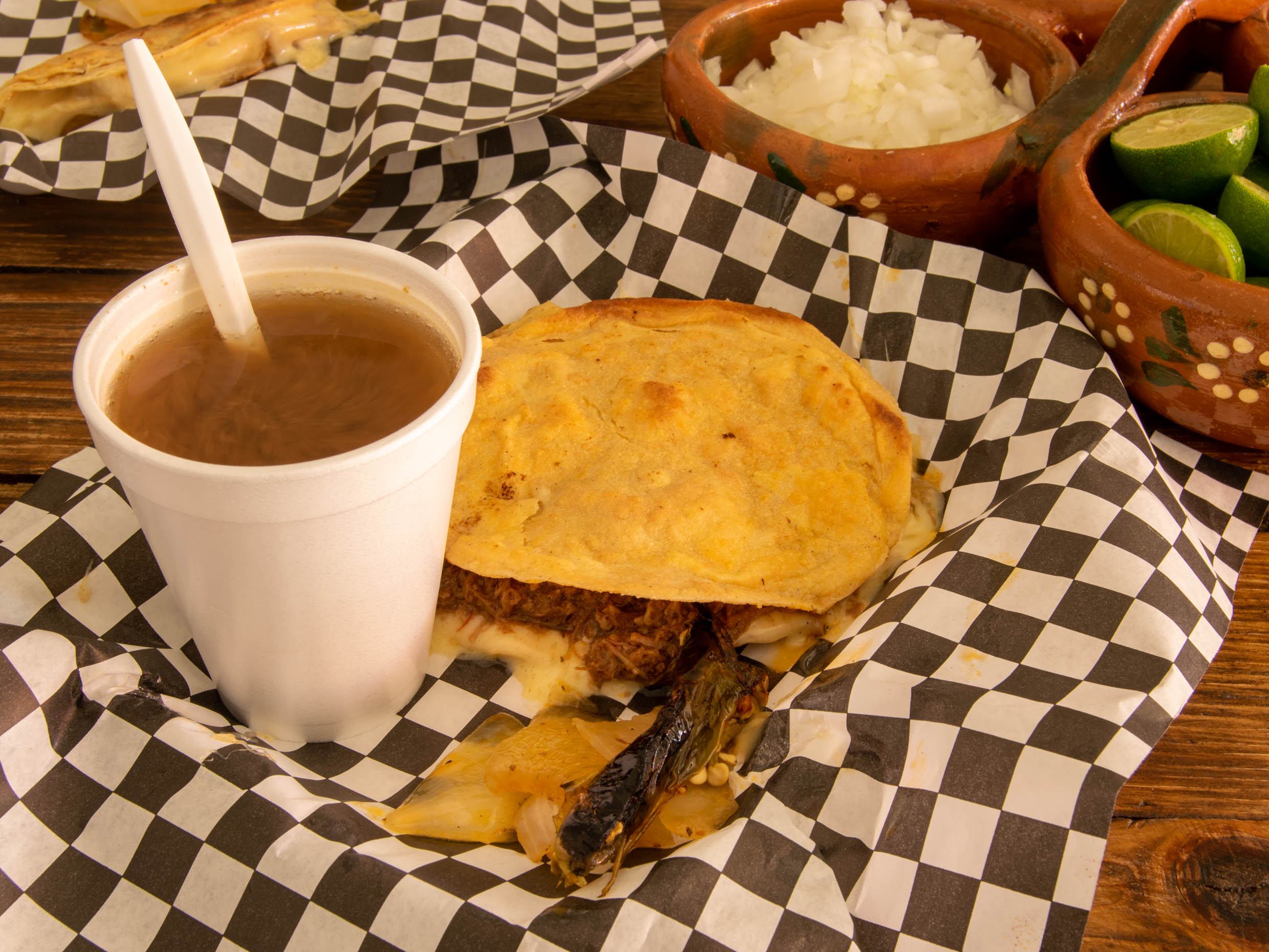 Torta de birria de res con queso acompañados de consome, salsa de la casa, cebolla, repollo, limones, cilantro, ademas de chile, cebolla asada.