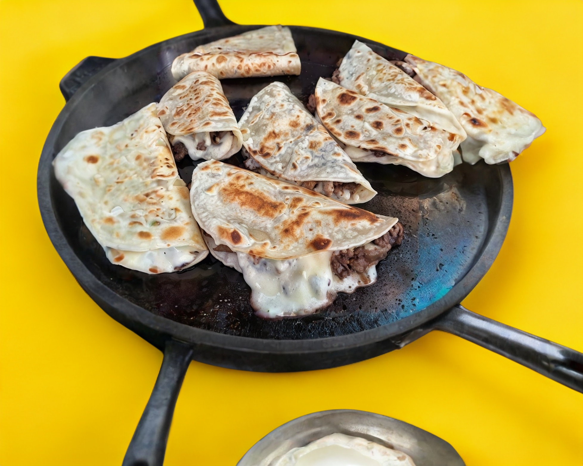 QUESADILLA CON CARNE ASADA, ACOMPAÑADA DE GUACAMOLE, FRIJOLES, SALSA BANDERA, SALSA ROJA, CEBOLLA ASADA Y CHILE