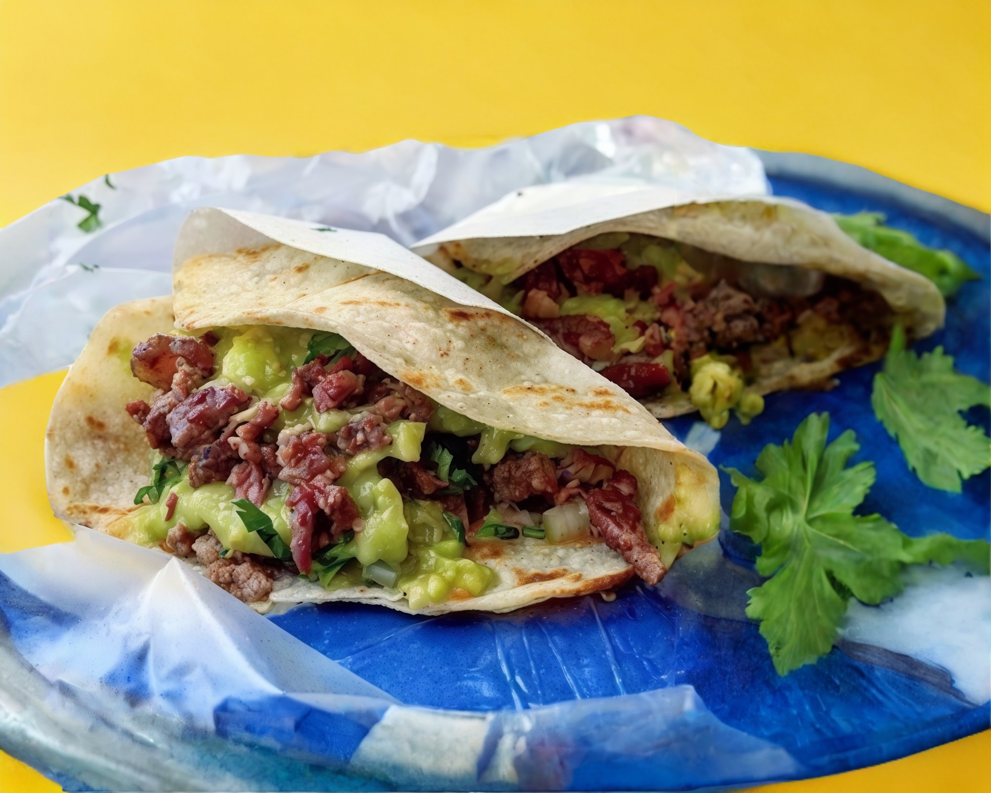 TACO DE CARNE ASADA, ACOMPAÑADO DE GUACAMOLE, FRIJOLES, SALSA BANDERA, SALSA ROJA, CEBOLLA ASADA Y CHILE.