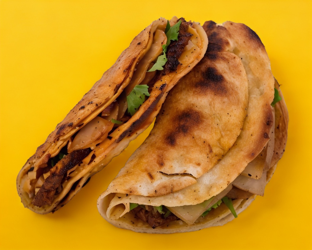 Quesadilla de tortilla de maíz doradita tipo sincronizada de birria de res y queso, acompañada de salsa de la casa, cebolla, repollo, limones, cilantro, ademas de chile, cebolla asada.