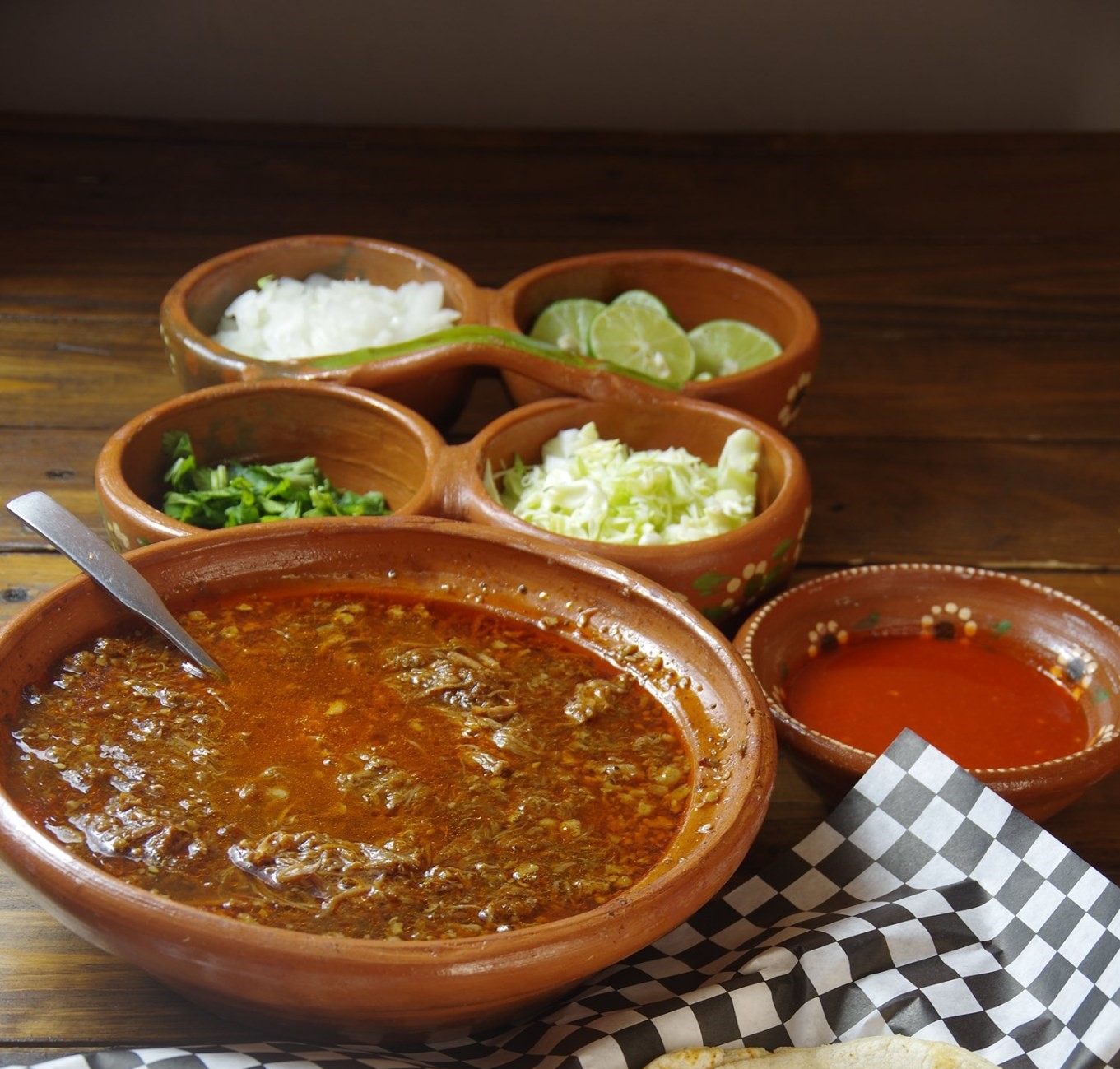 Media Orden de Birria acompañada de tortillas, salsa de la casa, cebolla, repollo, limones, cilantro, ademas de chile y cebolla asada.